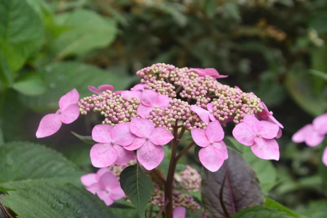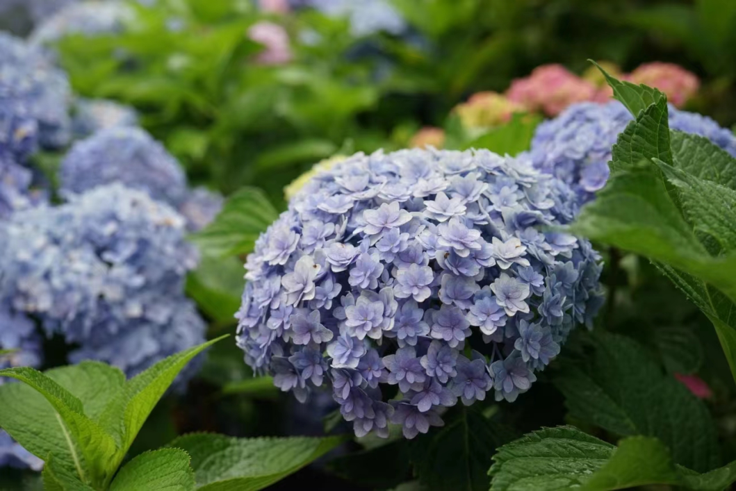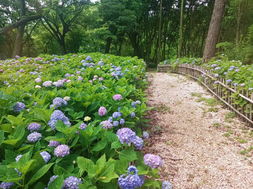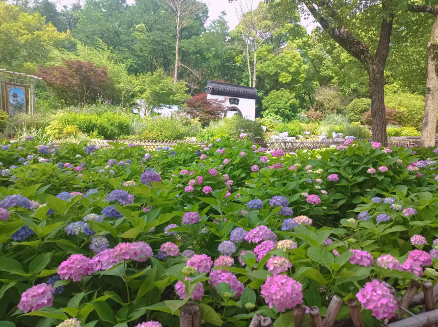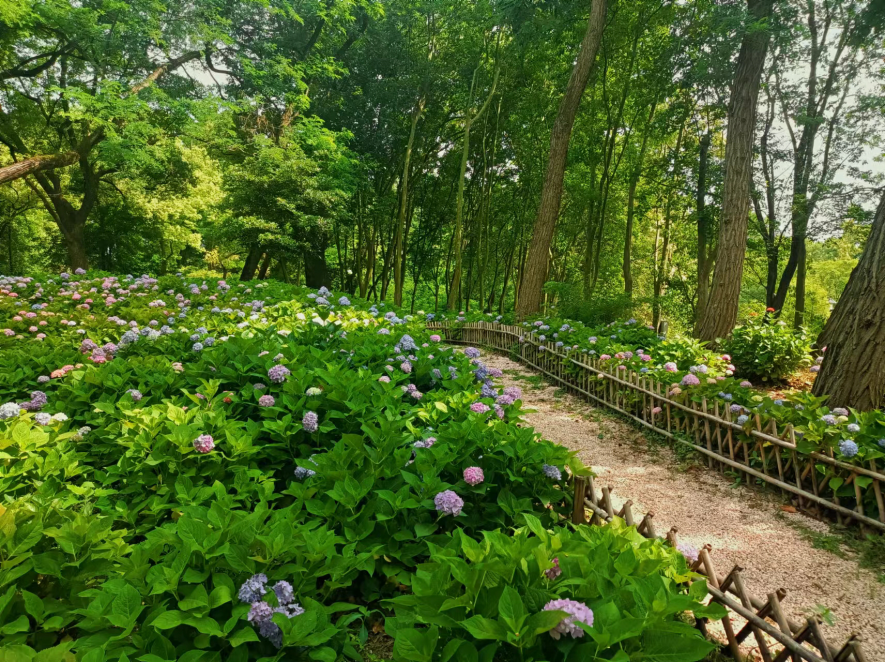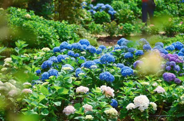 园内种植的八仙花多为“无尽夏”品种,其花期长,颜色清新优雅,变色更为梦幻。置身在花丛中,仿佛进入莫奈画笔下的花园,婀娜多姿的八仙花尽收眼底,令人目不暇接,流连忘返。