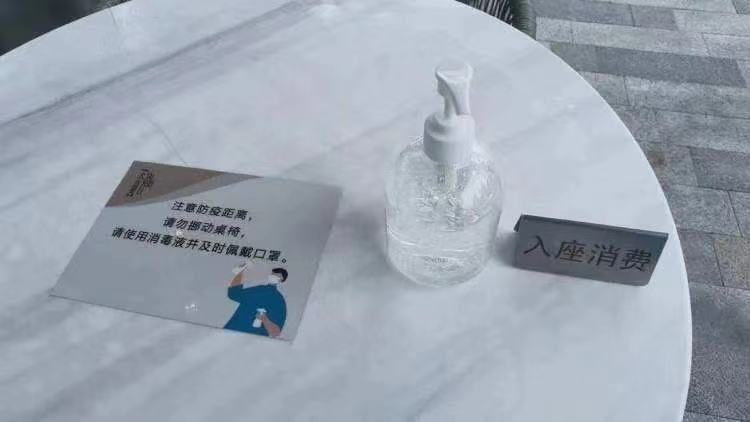 有餐厅在室外就餐区每张桌子上,都印了“注意防疫距离,请勿挪动座椅,请使用消毒液并及时佩戴口罩”的字样,每张桌子上放置了一瓶消毒液。