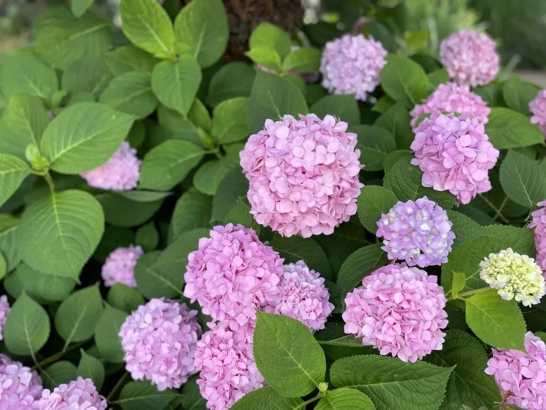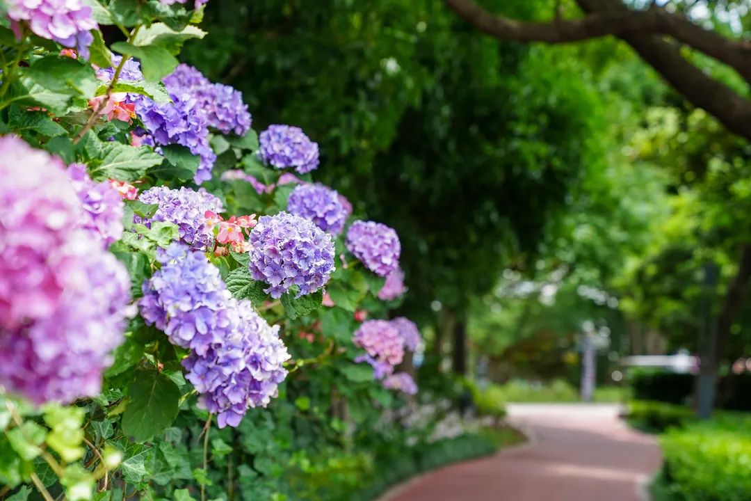 这里的绣球花开得圆润饱满、颜色斑斓,行人穿梭于绿地间,仿佛置身画卷。