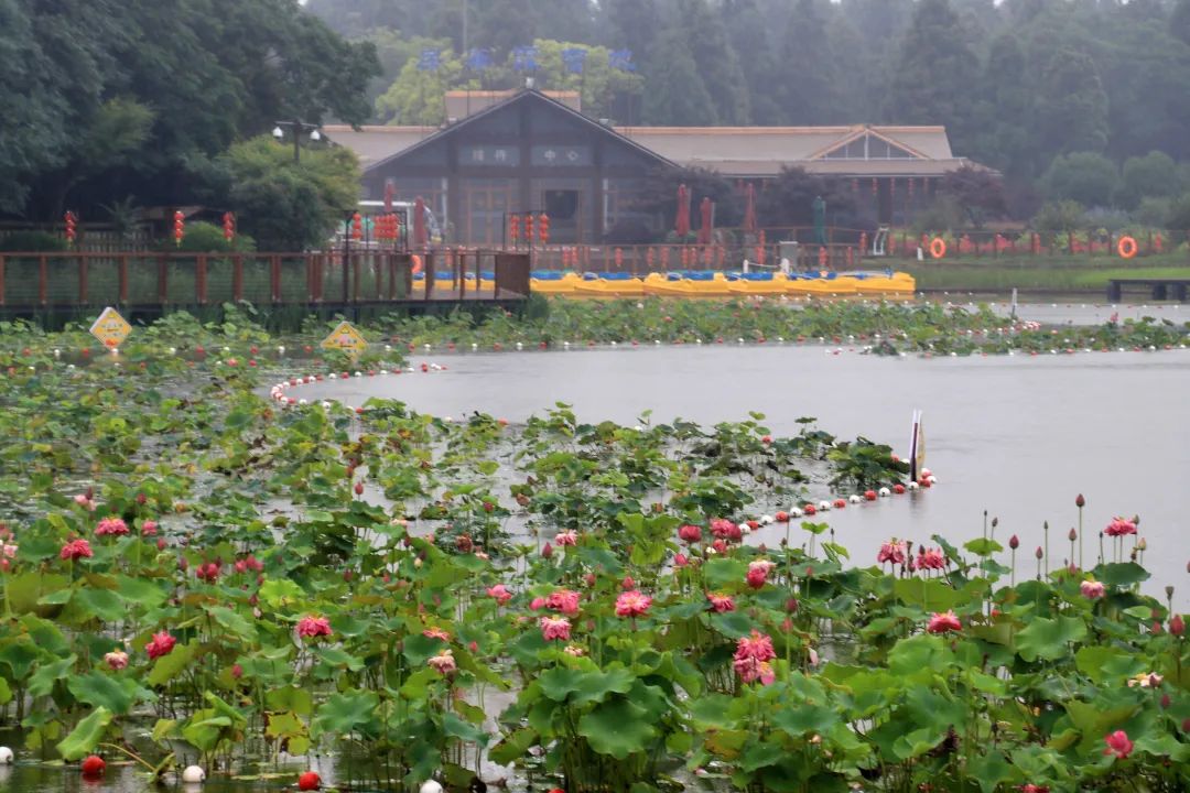 公园的“莲趣园”内9大色系的香水莲花竞相绽放,呈现出一片姹紫嫣红的美丽景象。朵朵盛开的莲花,呈现出紫色、黄色、红色等不同的色彩,亭亭玉立在叶面之上,像是一盏盏漂浮在水中的璀璨花灯,吸引了不少游客驻足观赏、拍照留念。这里种植的莲花除了观赏,还可以供游客下水采摘、泡茶品饮、扎染等,让游客们体验多样的乐趣。