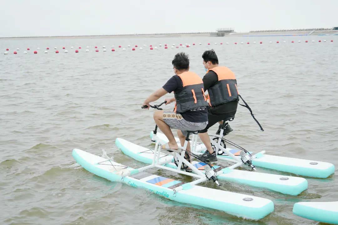 和爸爸吹着海风一起踏着水上自行车,谁说长大了就不能再有亲子时光?
