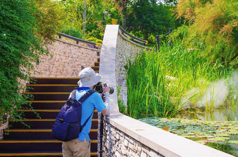 彩虹湾公园里的睡莲也已悄悄盛开。花朵微微露出水面,在莲叶的衬托下显得精致小巧。来这里晨练的市民绕湖边漫步一圈就是最佳赏花路线!