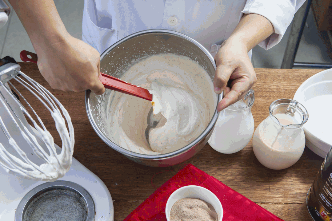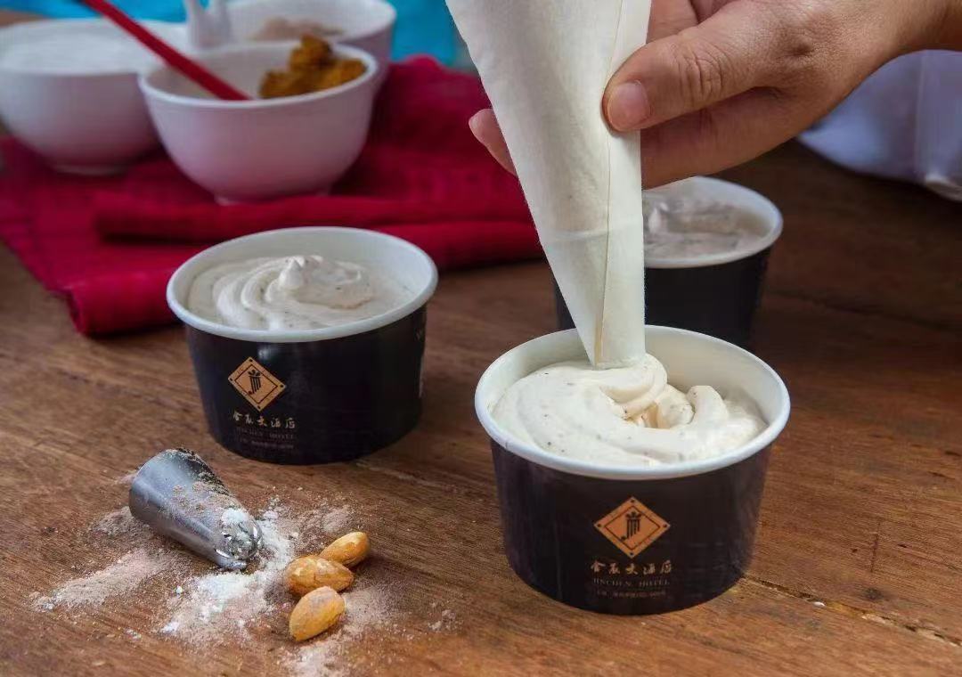 它的制作工艺十分考究,鲜牛奶要在冰箱里放到半冰半水时才拿出来打,多一分太硬,少一分不酥。冰糕里的核桃一定要用炒的,一斤核桃半斤糖,炒成焦糖色,混在奶糕里。