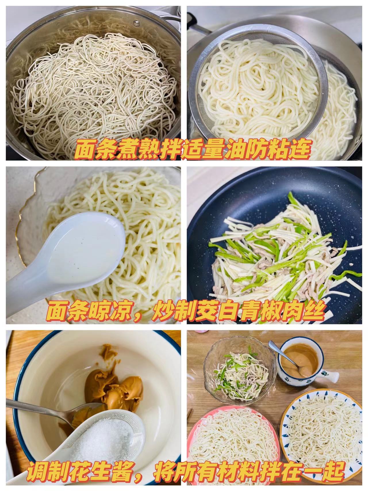 将面条隔水蒸至五六分熟,再到沸水里滚一滚,然后一定要用电风扇把面吹凉才算正宗,再拌点油免得粘连。花生酱调好后浇在面上。最后用浇头点睛,浇头往往有三丝、辣肉、素鸡、大排、鳝丝、面筋,爆鱼等几十种组合。