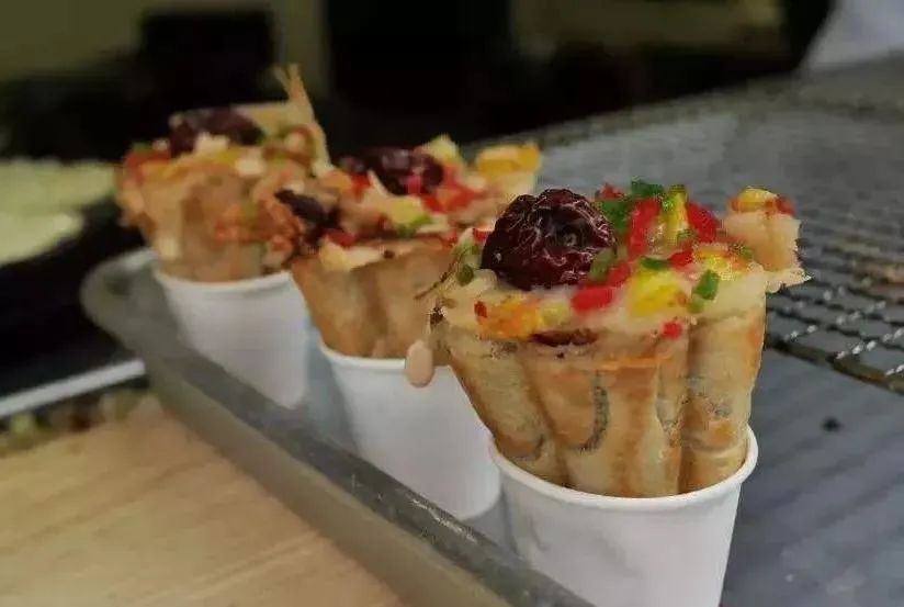 梅花糕形如梅花,上大下小,呈五棱形,表面上红红绿绿的糖丝,很是好看。