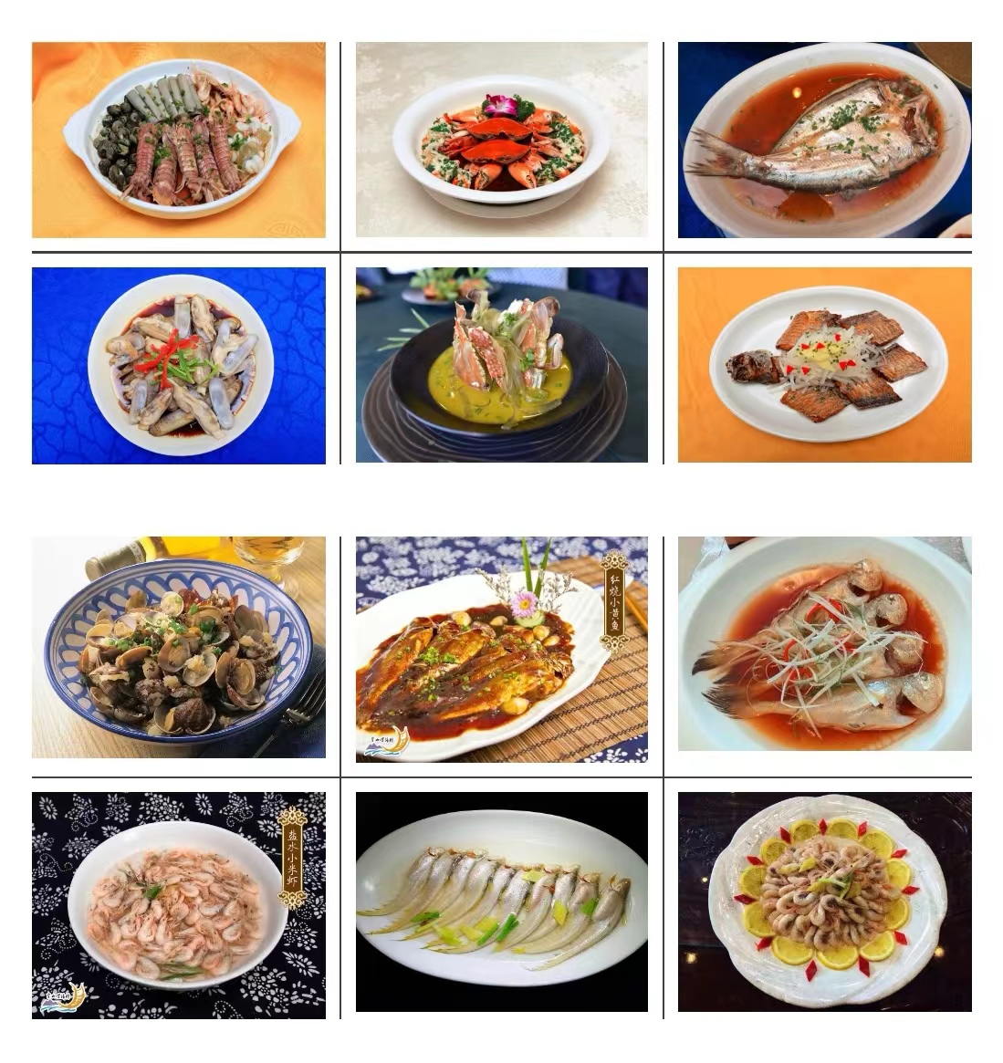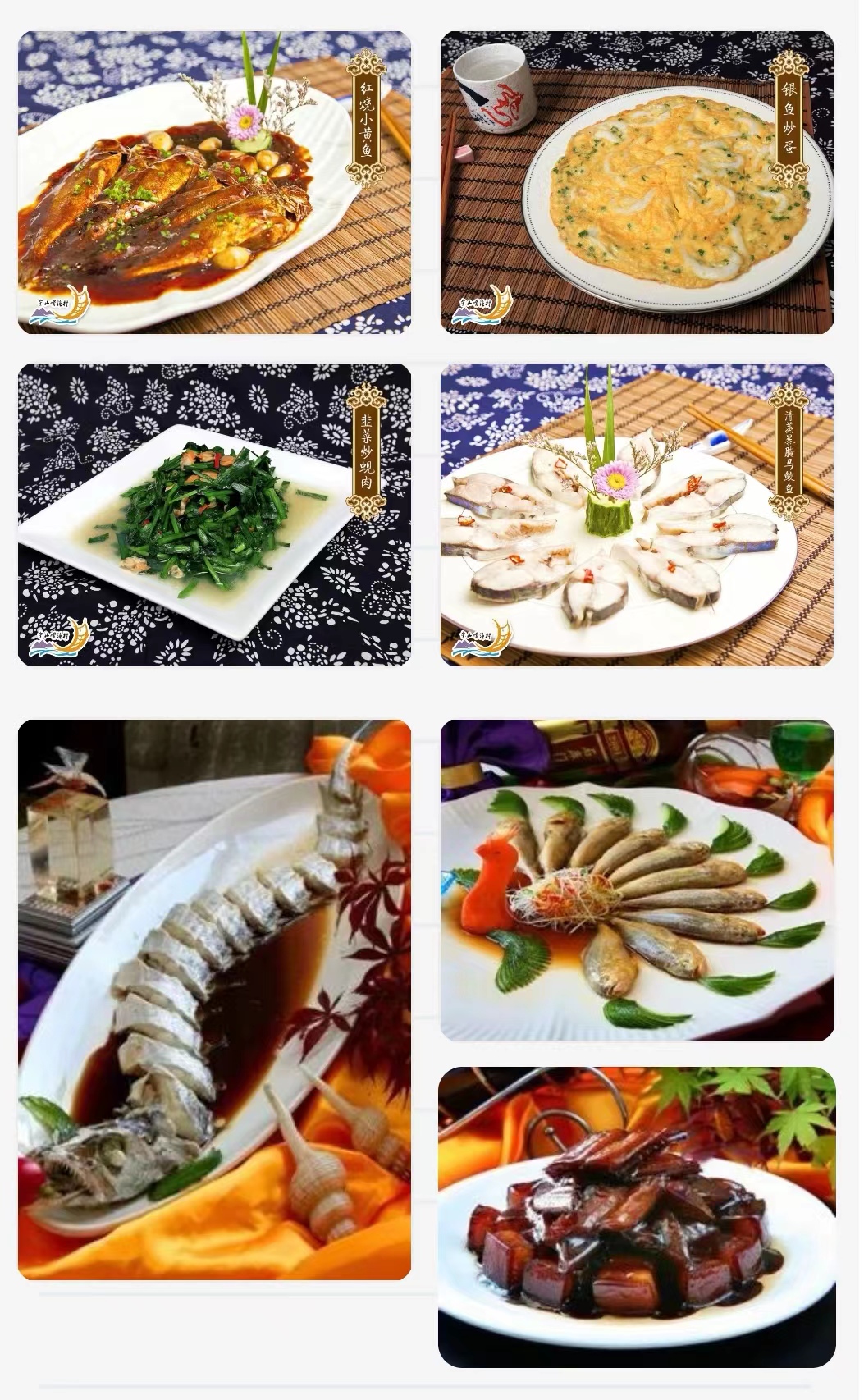 十大特色菜——沧海拾贝(雪菜莲婆汤)、牵须登场(盐水白虾)、虾兵小将(红烧闸网鱼)、海陆佳配(鳗鱼干烧肉)、日月升平(咸鳓鱼炖蛋)、孔雀开屏(清蒸梅童鱼)、变色青龙(红烧海鳗鲡)、银龙上滩(清蒸带鱼)、无鱼伦比(红烧乌鯩鱼)、解甲归田(葱油梭子蟹)