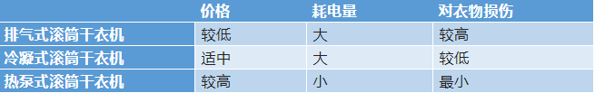 我们对三种烘干机在大家最关心的价格、耗电量、对衣物损伤程度方面进行了比较,如下表所示。