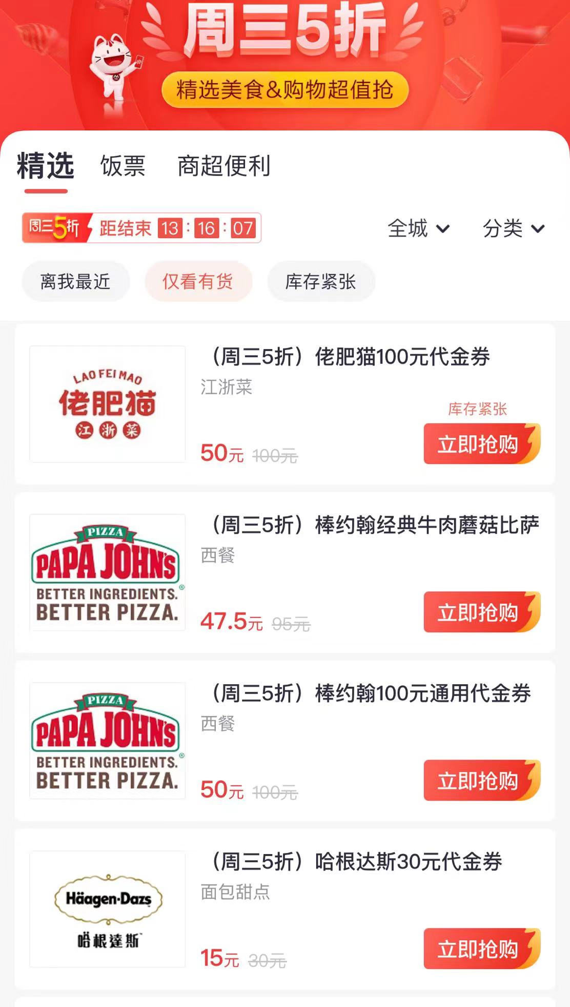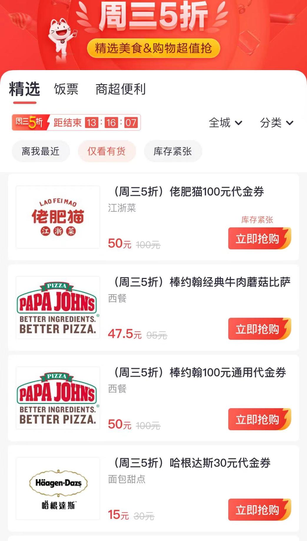 同时也不要忘记银行卡的优惠券。今天上海恢复堂食刚好是周三,招商银行的“掌上生活”刚好有周三五折券可以抢。