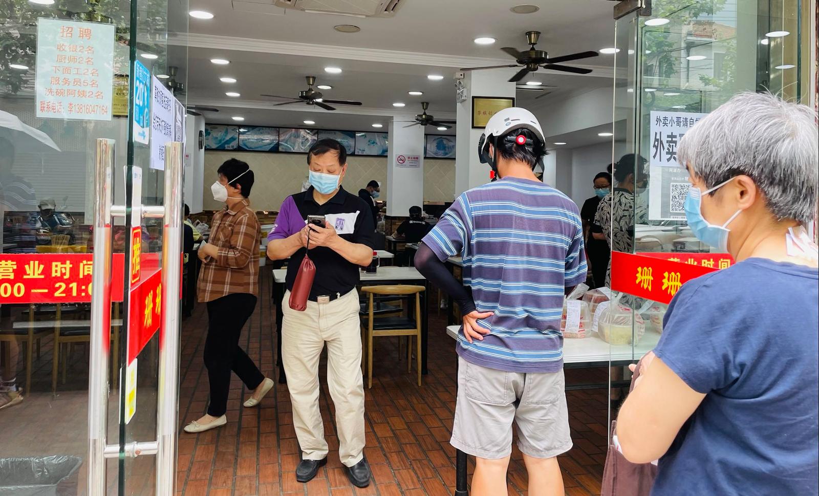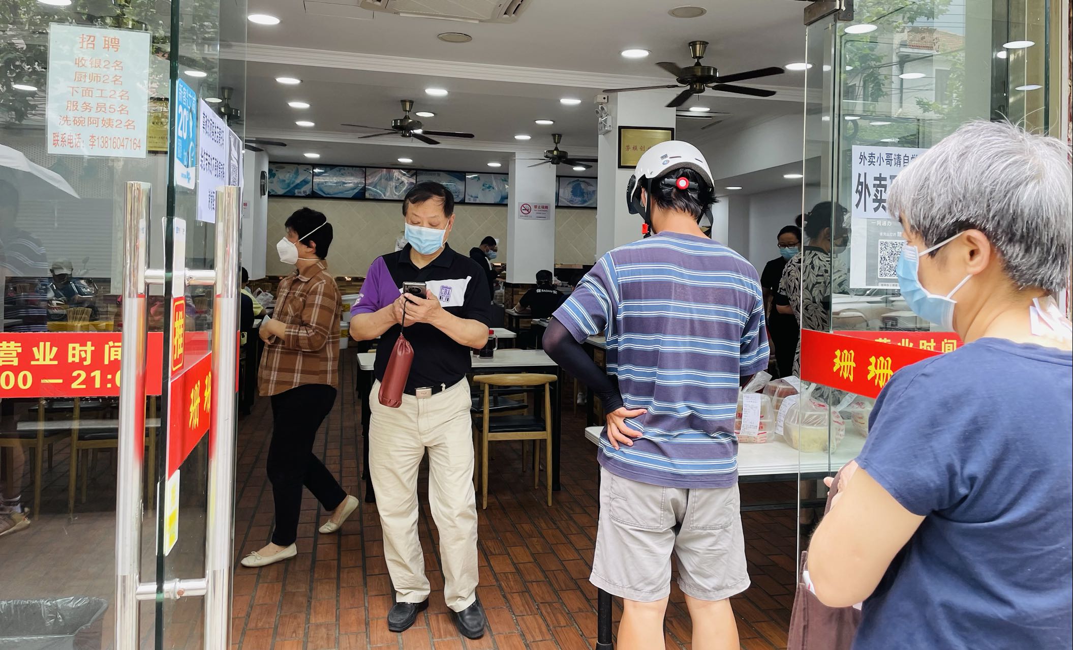 吃完小笼从店里一路走回来,看到路边的不少店铺都可以堂食了,菜饭骨头汤、麻辣烫、肯德基、星巴克……有不少人在店门口扫场所码,走进店里堂食。