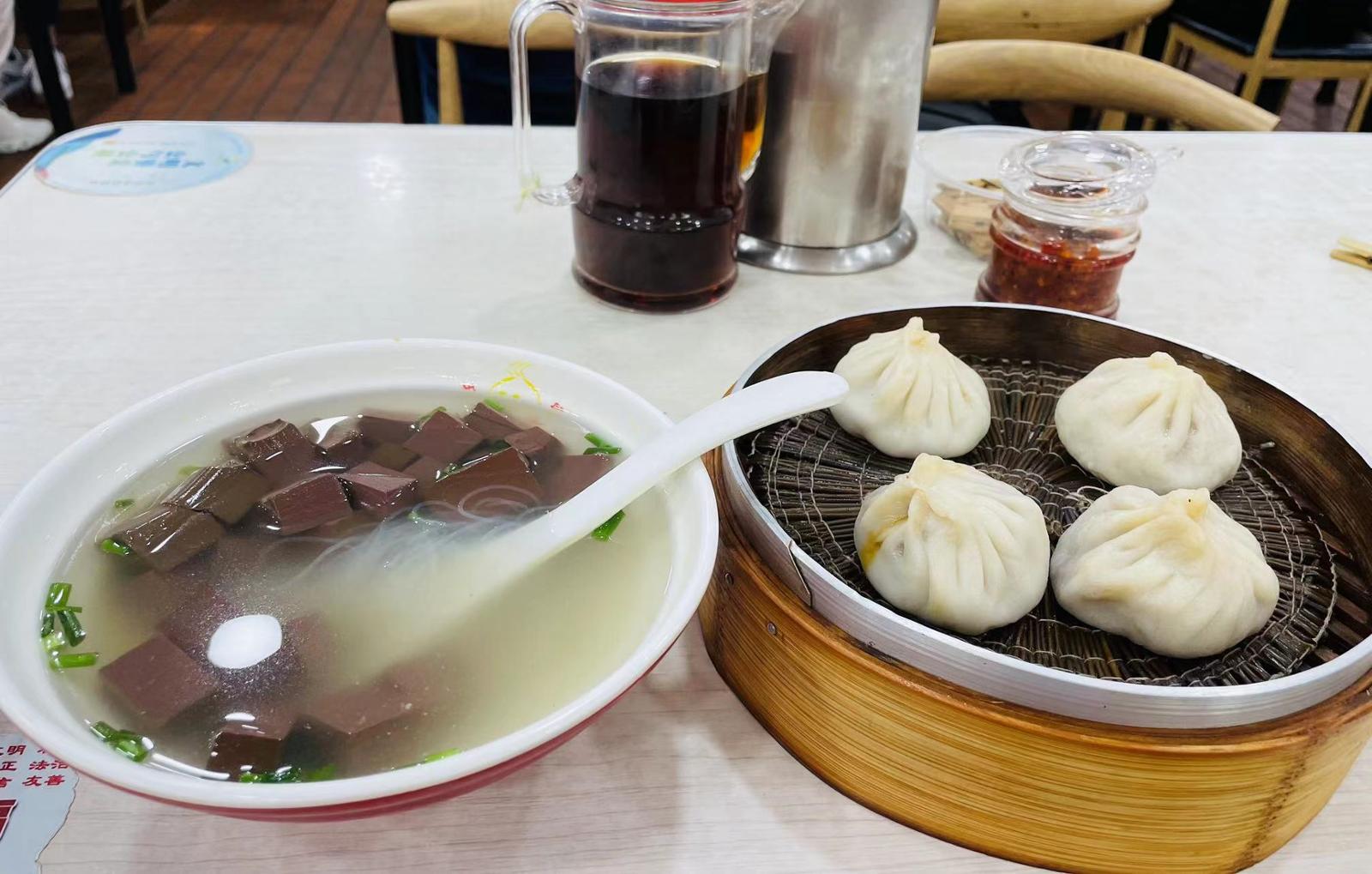 我点了无锡小笼和鸭血粉丝汤,看到大家都自觉分开坐,井然有序。除了冷面需要自己排队拿,其他品类都有服务员送到桌子上。