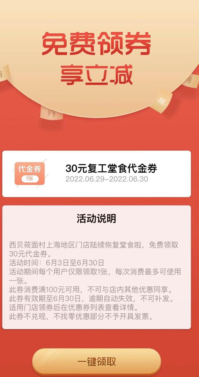 一些品牌店在自己的公众号上推出了针对上海用户的堂食优惠券,如果你正想去吃某家店,可以关注下该店铺的自媒体平台。比如在“西贝筱面村”公众号输入“上海复工券”就可以得到一张30元的堂食代金券。