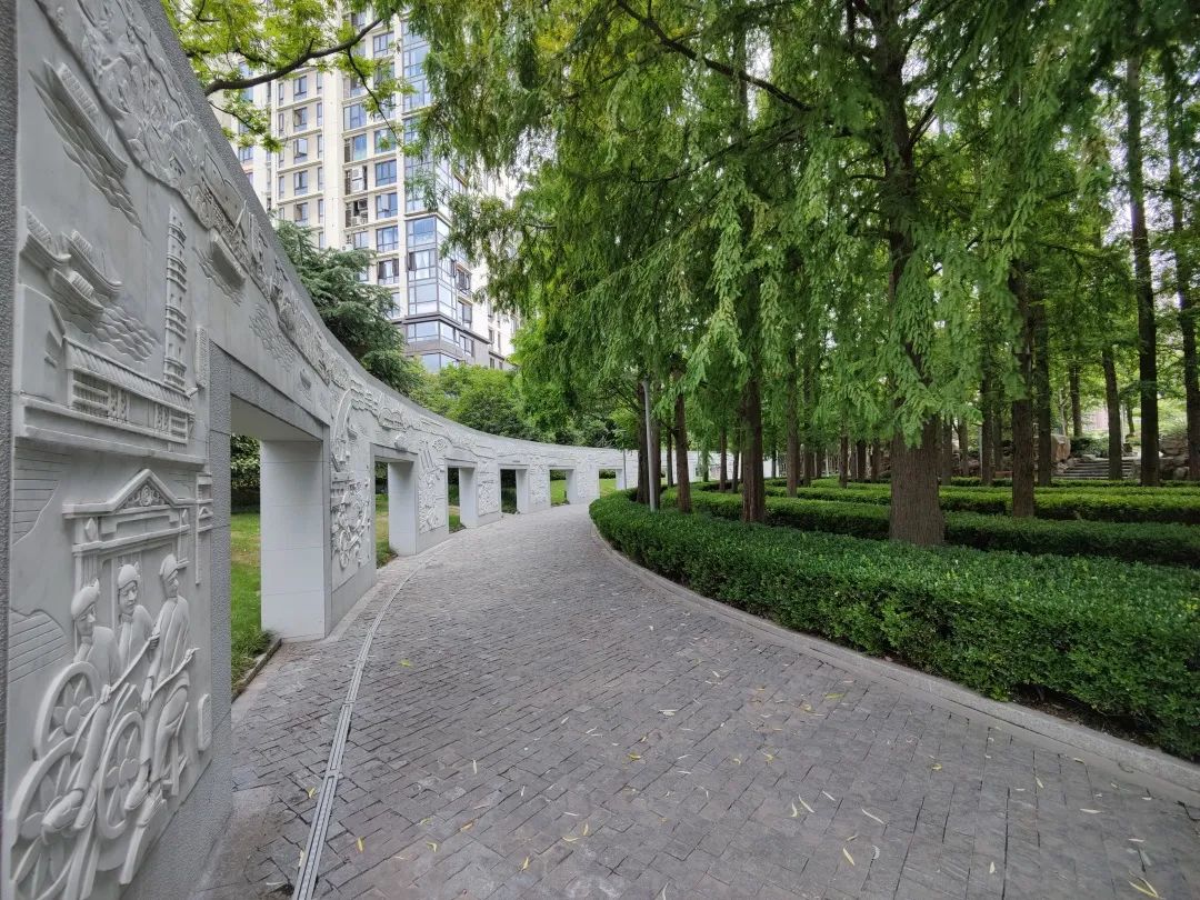 人造假山平台上设置了多处座椅,供游园市民休憩、纳凉。正对着的白色浮雕墙满目清爽,行走在旁,仿佛穿越时空感受了上海的历史。