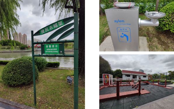 园内的篮球场等健身场所也暂未开放,不过园内随处可见便民衣帽架,可以方便市民挂包和外套,还贴心地提供直饮水,夏日游园很是方便。