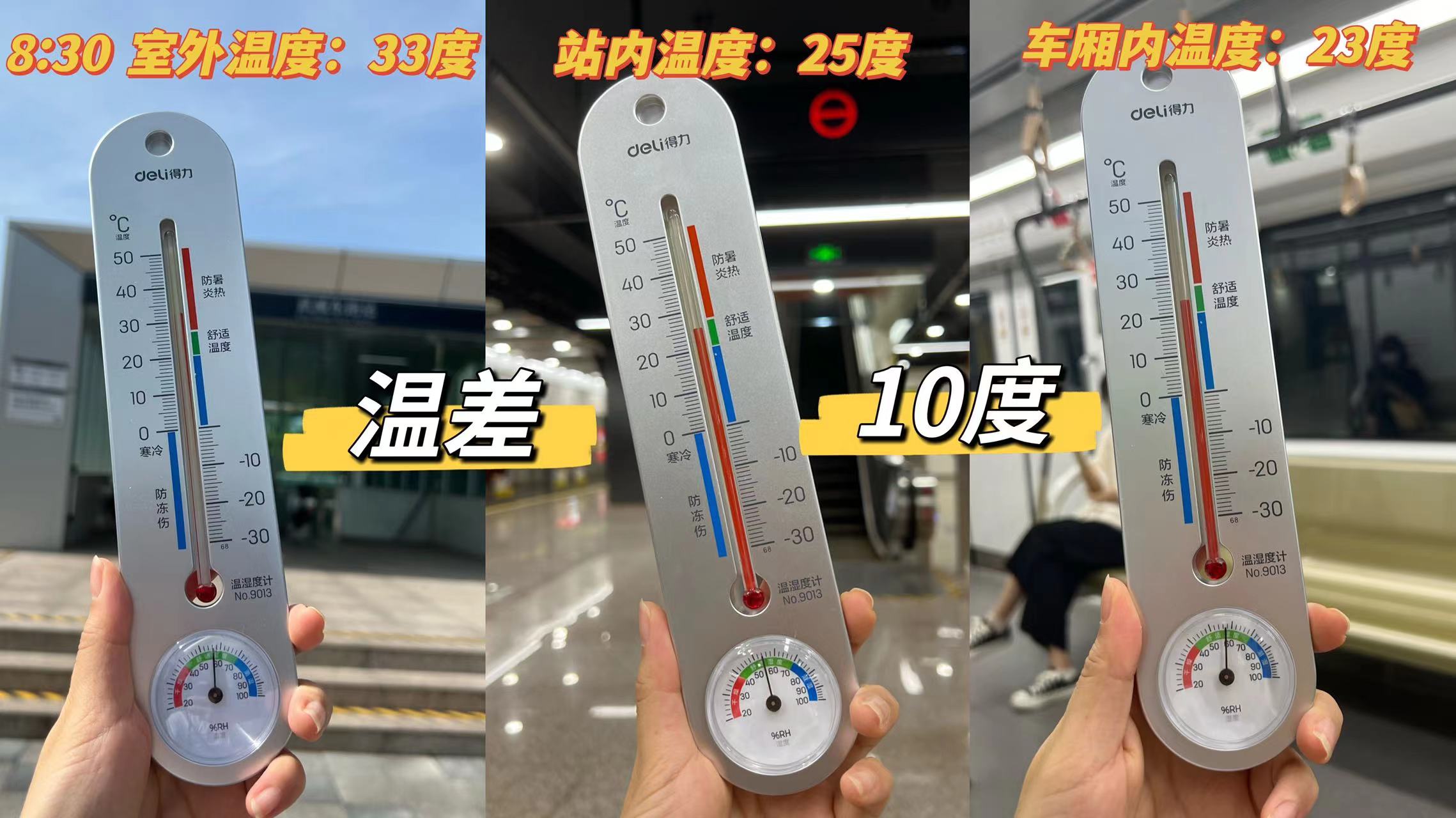 乘客从室外高温的状态下进入地铁车站,车厢与室外最大温差在10摄氏度上下。