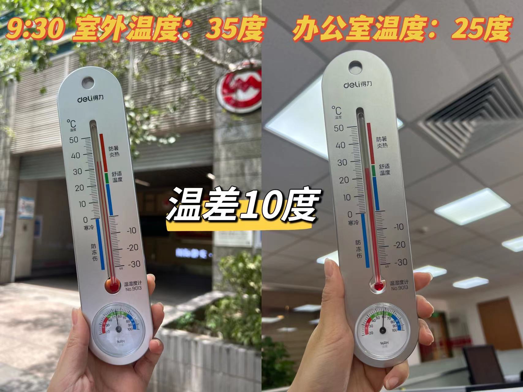从室外高温的状态下进入办公室,办公室与室外最大温差在10摄氏度上下。