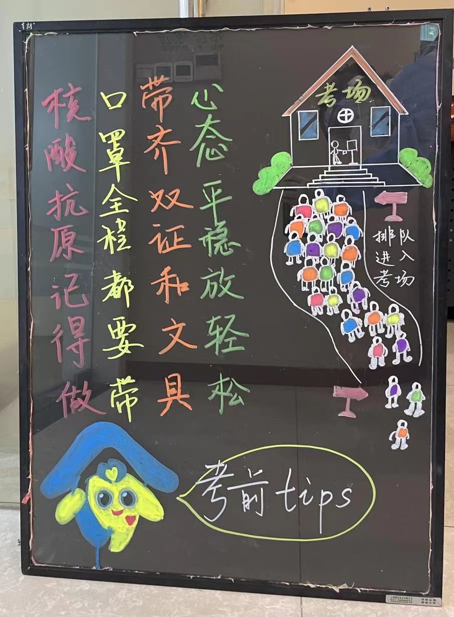 “核酸抗原记得做,口罩全程都要戴,带齐双证和文具,心态平稳放轻松。”建行上海静安支行营业部打破传统,为附近的考生送上祝福,还在“劳动者港湾”内开展 “高考锦囊”小讲座,帮助考生及家长做好考前情绪调整和准备工作,让考生轻松备考,从容应考。