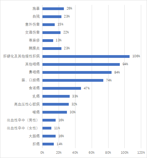 每日饮用约1两高度白酒所增加的疾病/伤害发生/死亡风险(%)