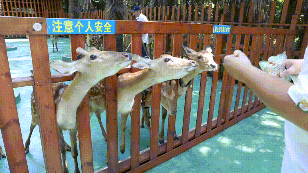 “树深时见鹿,溪午不闻钟”,森林秘境中的这群“小精灵”若隐若现,野趣十足。细细留意,你可能在林间水边偶遇梅花鹿!鹿乐苑中的梅花鹿深受游客喜爱,只要你的手上拿着鹿饼,小鹿们便立刻争先恐后地凑到栏杆前,伸出长长的舌头,不断向你点头示好,以求得眼前的美餐,模样十分娇憨可爱。