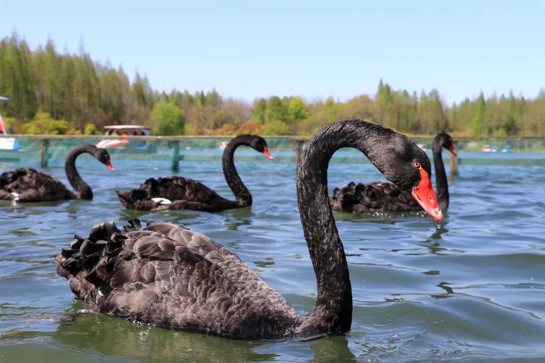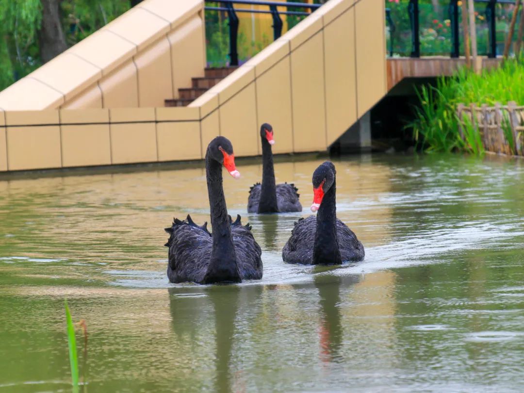 漫步于锦湖天地下沉式栈道,可以偶遇时而优雅地游弋,时而调皮地潜水,时而嬉戏着讨食,时而欢快地拍打翅膀,调皮的黑天鹅为水杉湖畔增添灵动生机。