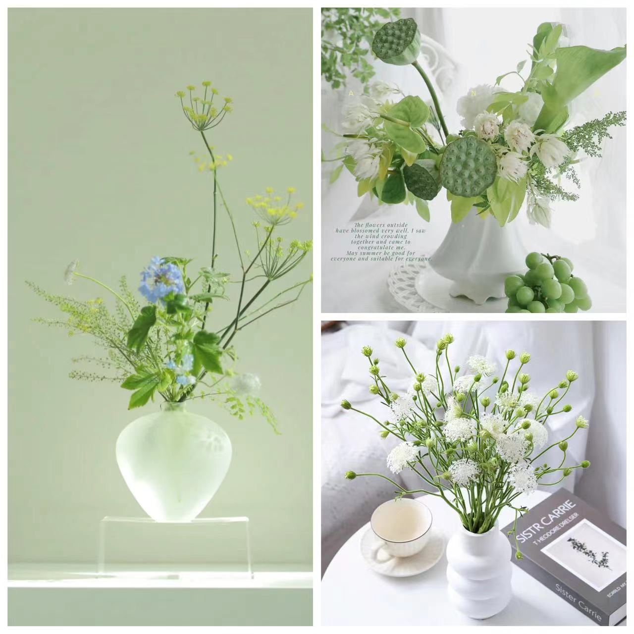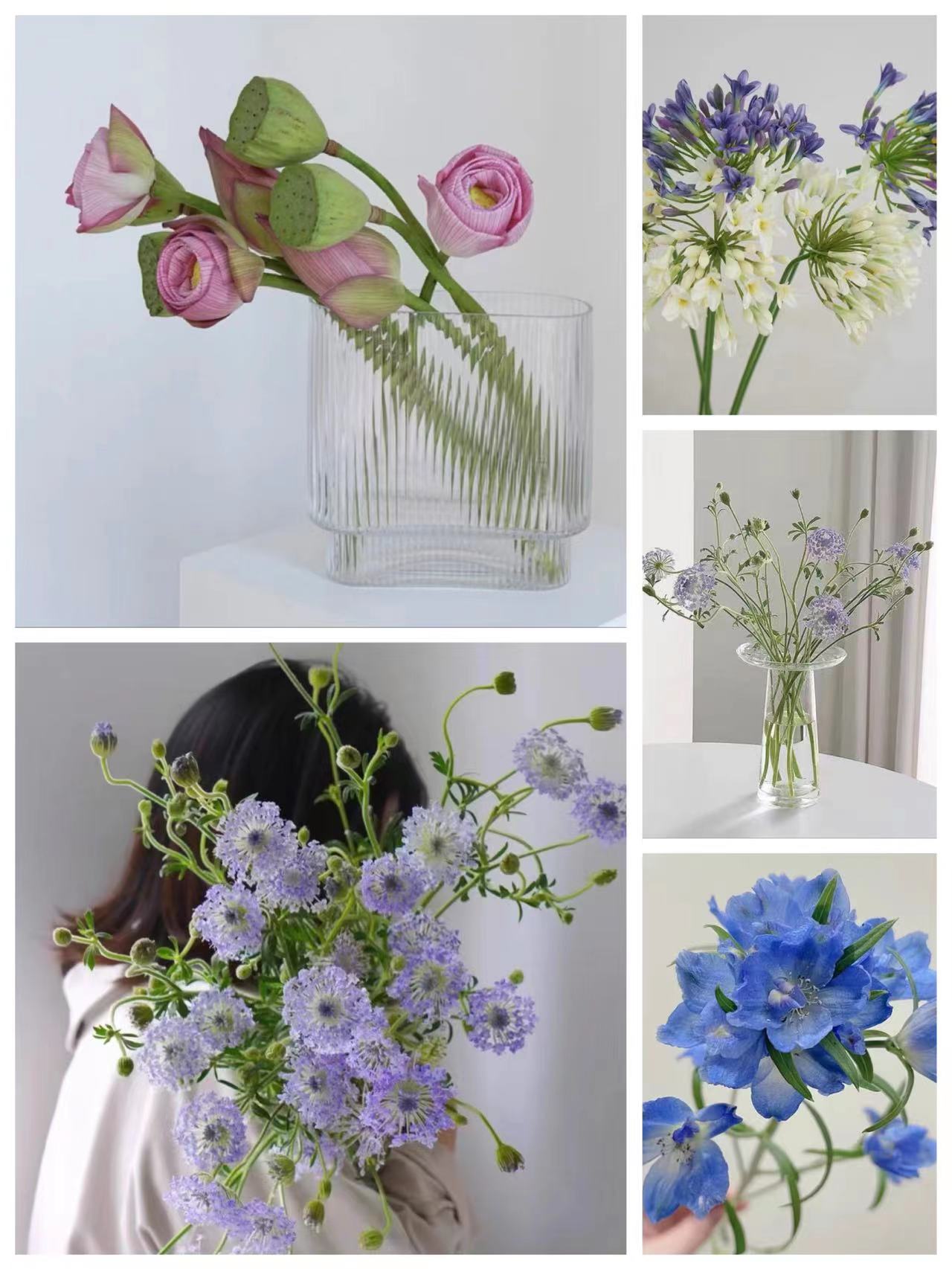 在花器的选择上,夏季一般为简约风格,建议选玻璃、素色瓷器、藤编蓝等质感的花器,欧式常用的华丽花纹的就不太合适哦。