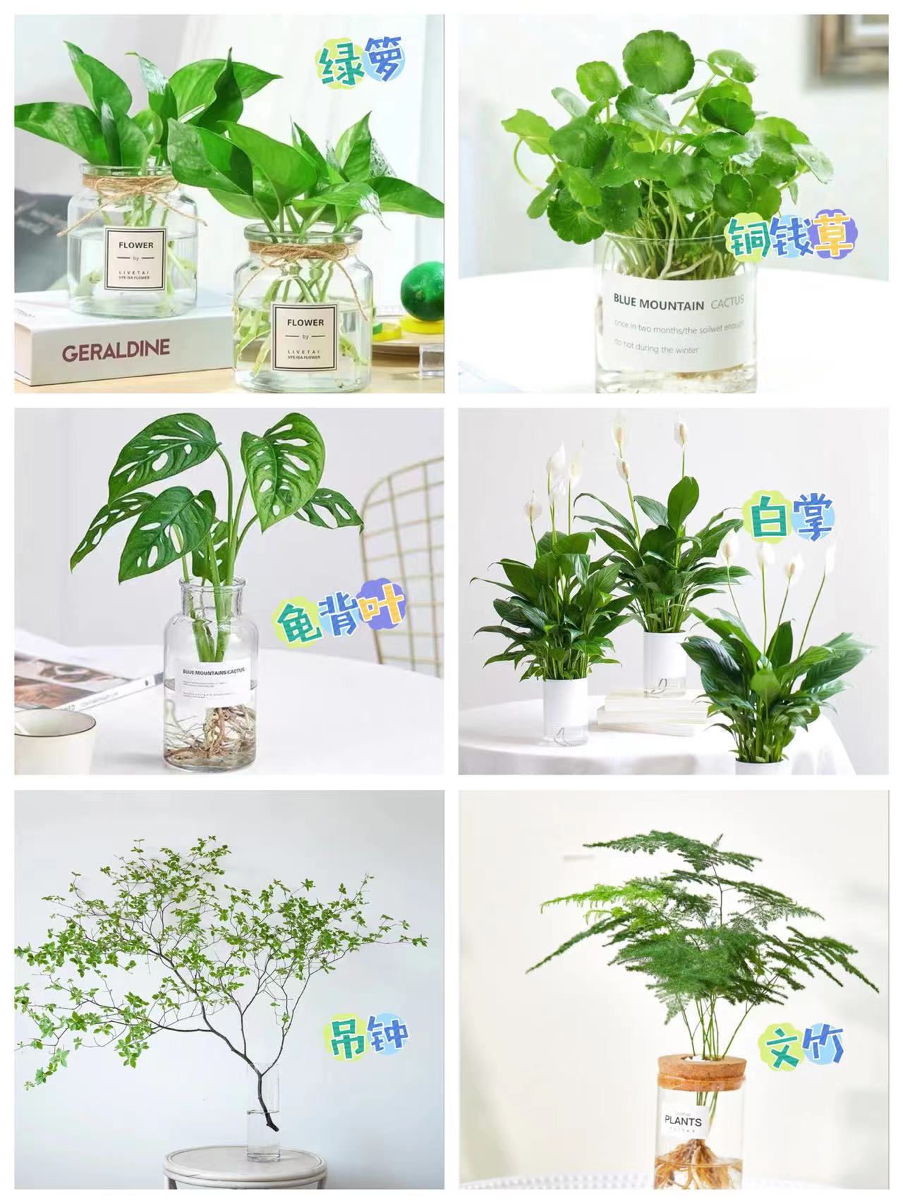 办公室常见的:绿萝耐受性强,最为好养;铜钱草小巧可爱有葱茏之感;龟背竹、白掌随意插一株在玻璃花瓶中便是文艺小清新担当;文竹、吊钟则更清新雅致一些……