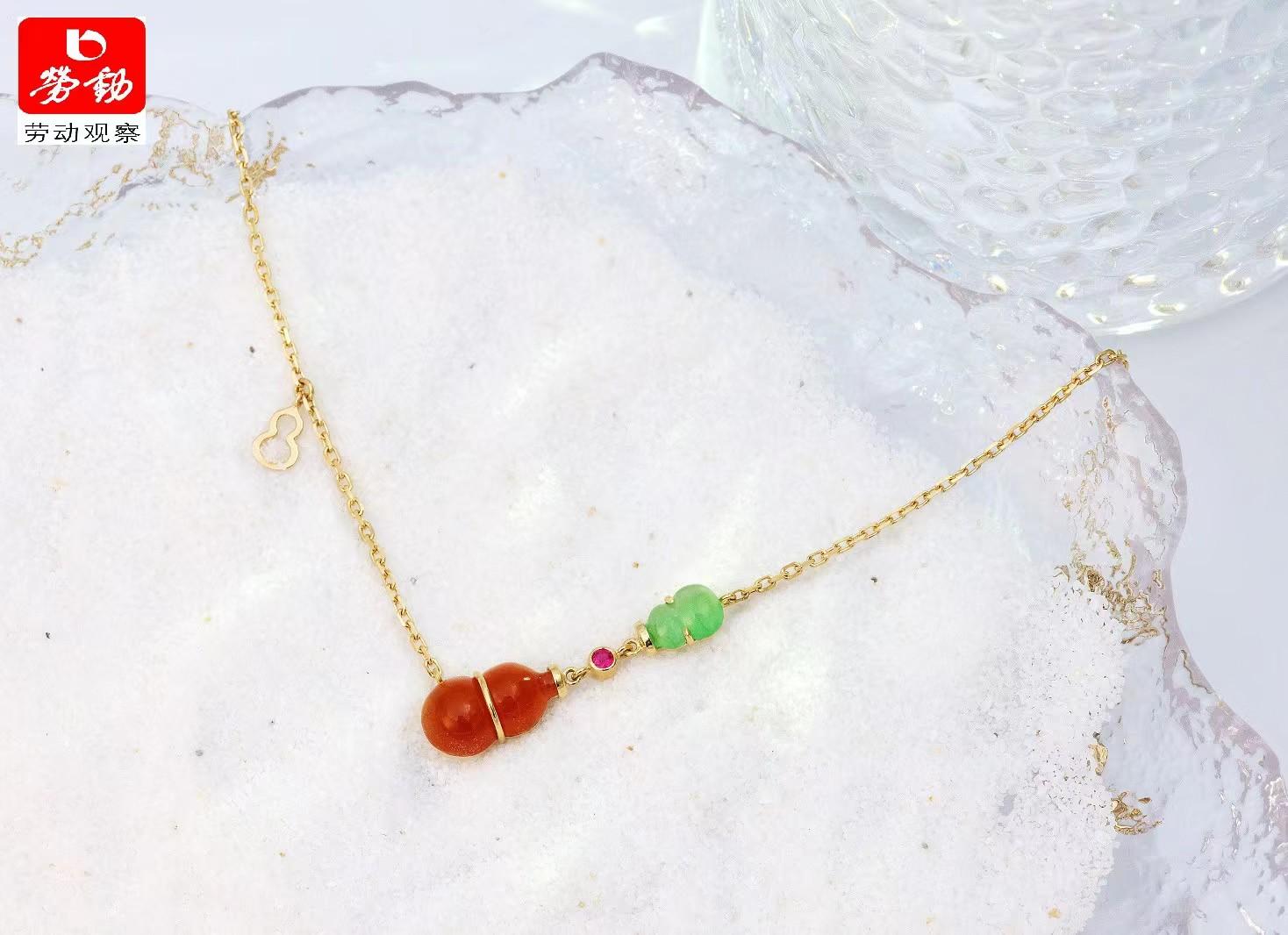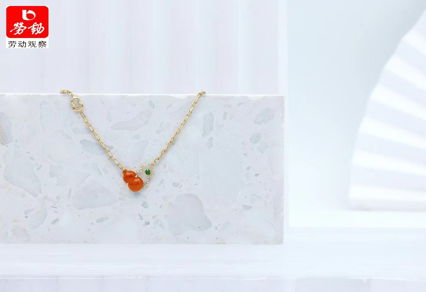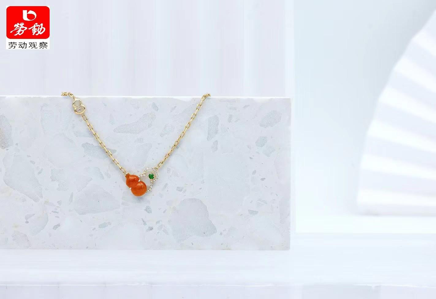 老凤祥红翡绿翠系列首饰有几款,一款以红翡为主角,小颗粒的晶莹绿翡点缀在镂空的K金和钻石构成的金葫芦内,画龙点睛,精巧细致;一款以大小不同的两个红翡绿翠葫芦为AB角,当中以红宝石点缀,端庄秀气;另一款则是红翡为唯一主角,两条金色的挂链搭配小钻石延伸线条感,活泼灵动。