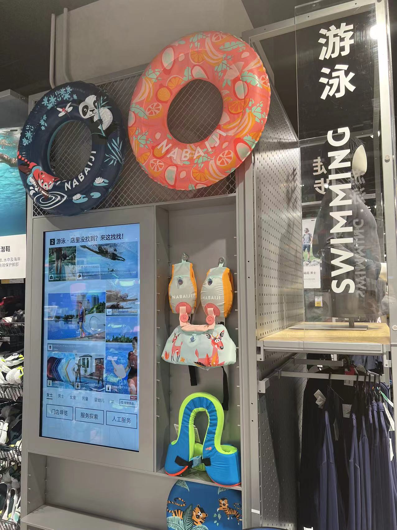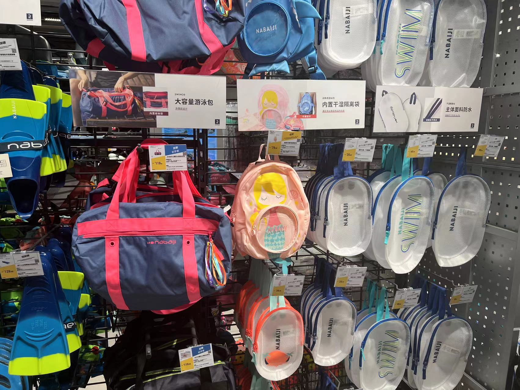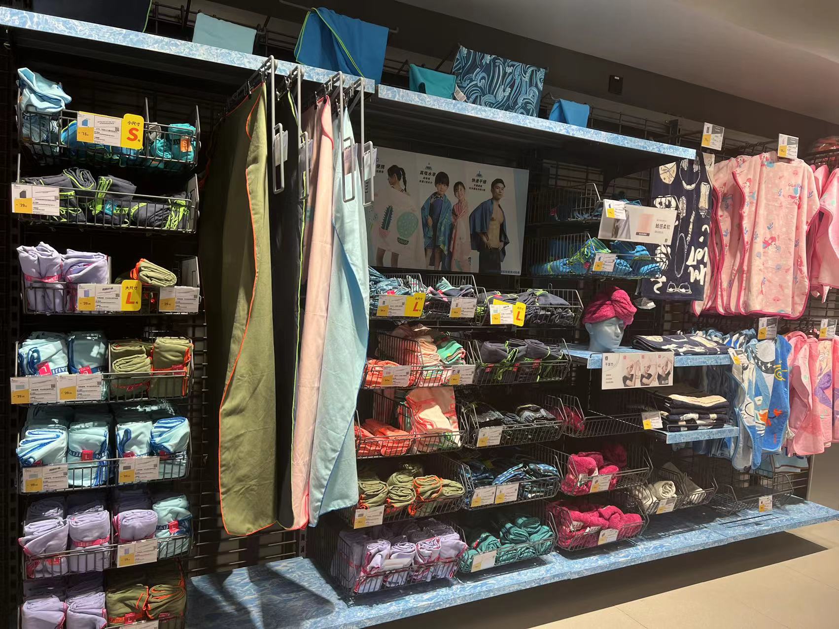 在一家运动用品商店里,游泳装备区域占据了店内比较醒目位置,不少市民正在挑选游泳装备。