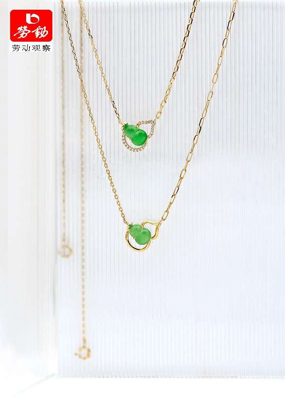 三款项链又有细微差异,有的是以钻石勾勒出金葫芦,钻石光芒与翡翠的水头相映,水润灵动;有的以亚光的K金勾勒金葫芦,和绿翡互为映衬,简洁大方;有的在金葫芦内以祥云纹的金线修饰,优雅精美,细节感满满。
