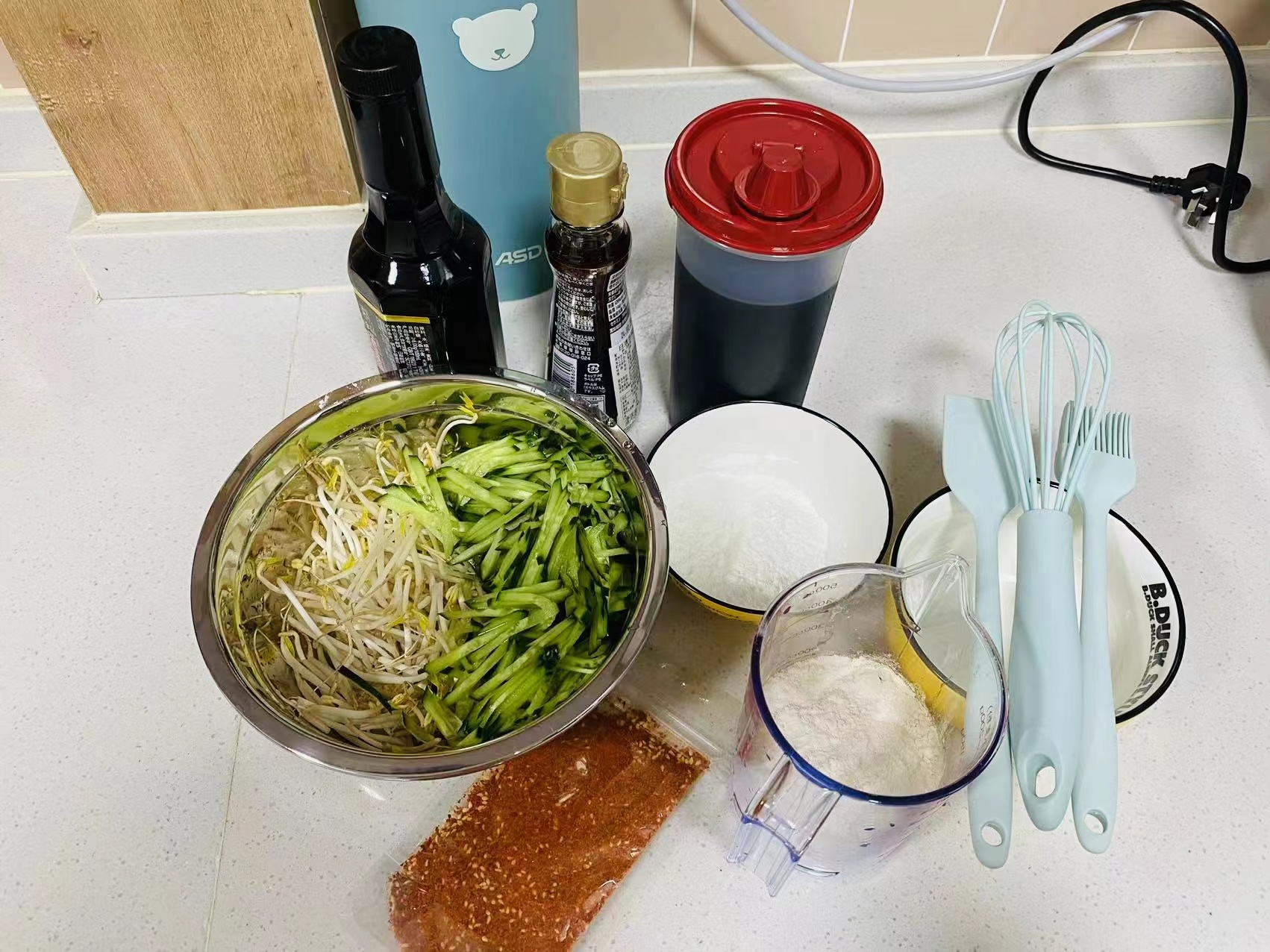 准备材料:面粉 淀粉 黄瓜 豆芽 蒜 酱油 醋 辣椒面 盐 香油
