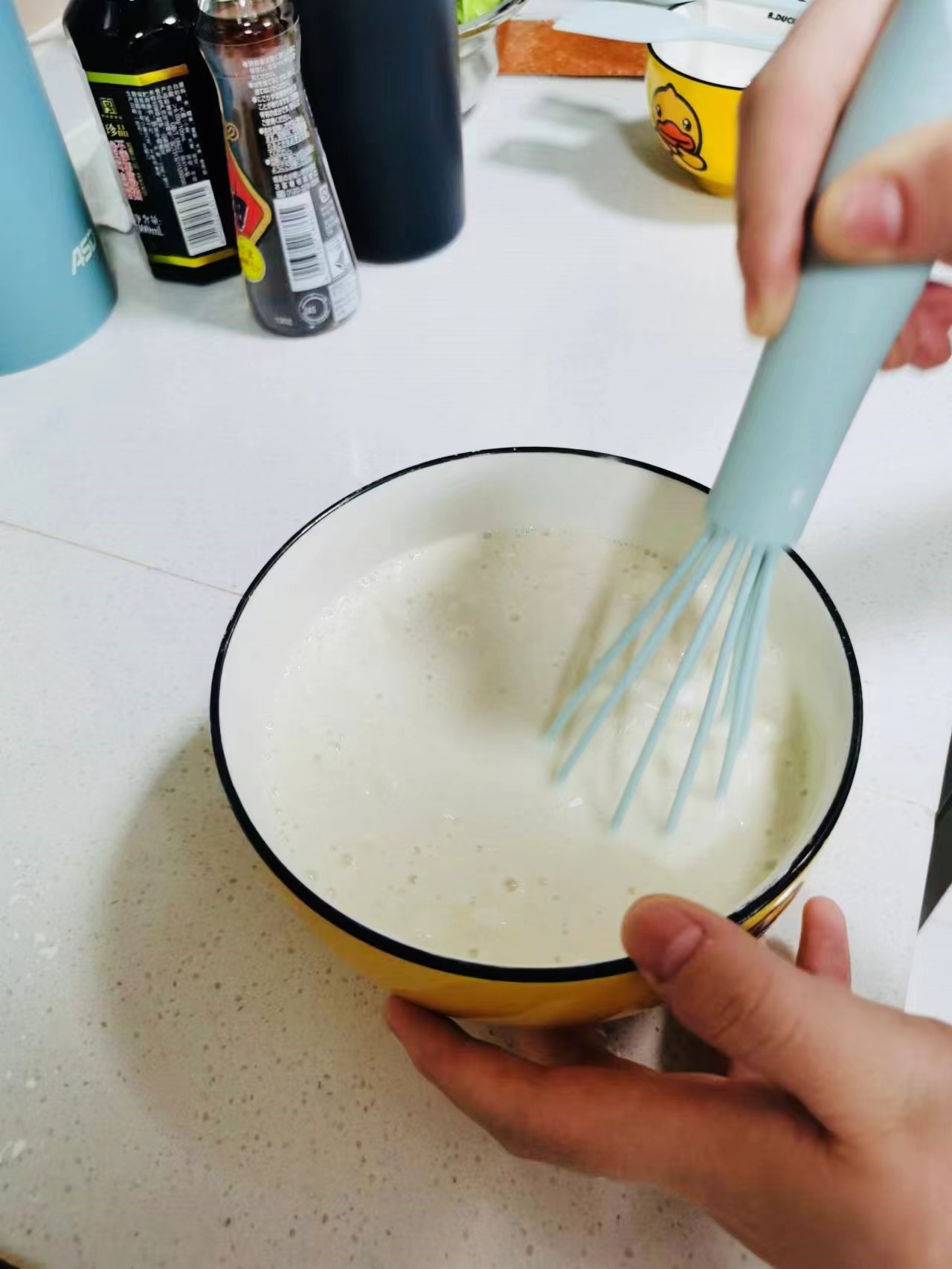 将面粉和淀粉以1:1的量加入碗中,加盐,倒入清水,搅匀,静置20分钟,可以用滤网将面浆过滤一下。