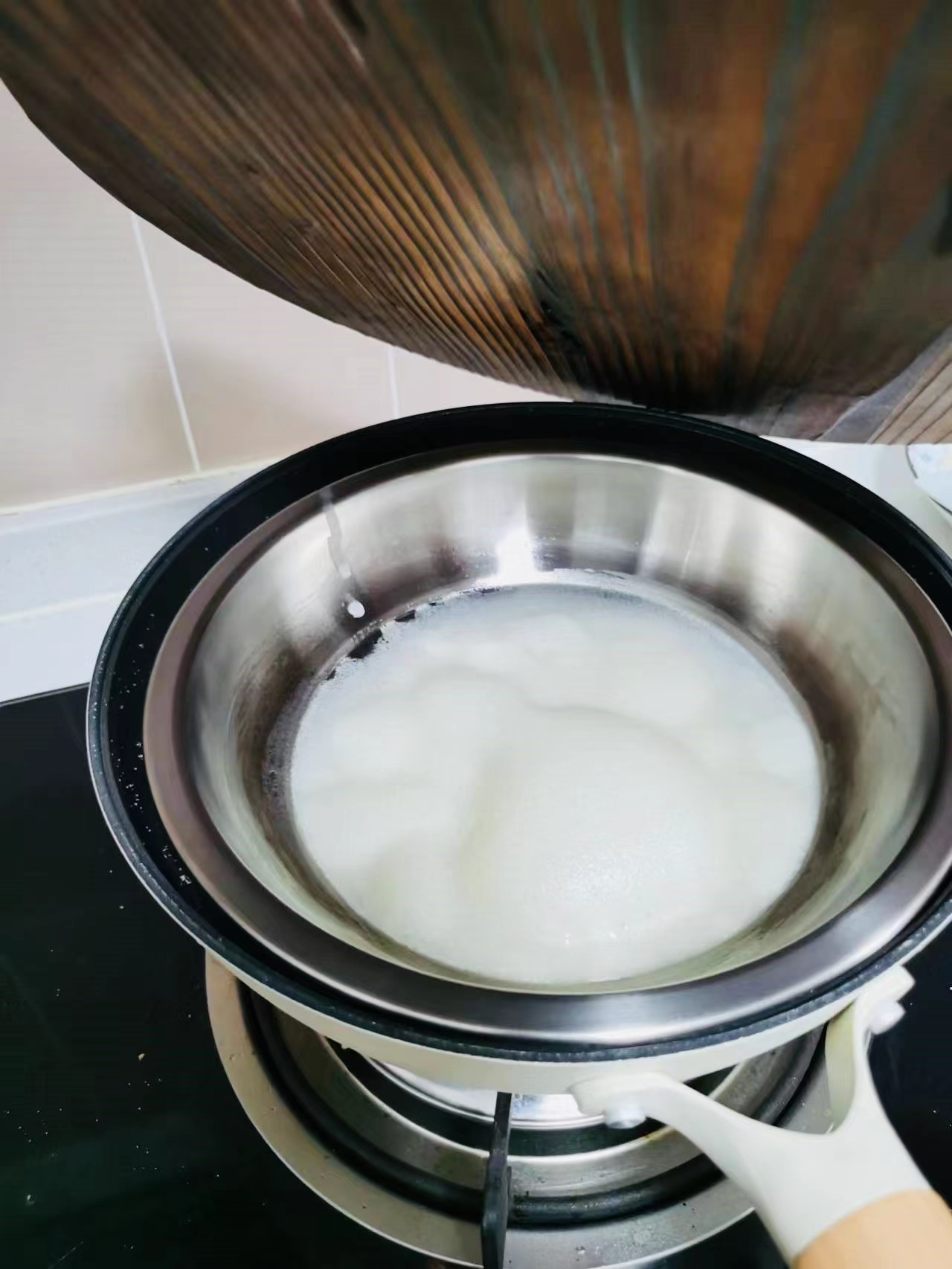 金属盘抹油,放入面浆,让面浆均匀地铺开,放入烧开水的蒸锅中,等到面浆鼓起大泡后,取出金属盘。