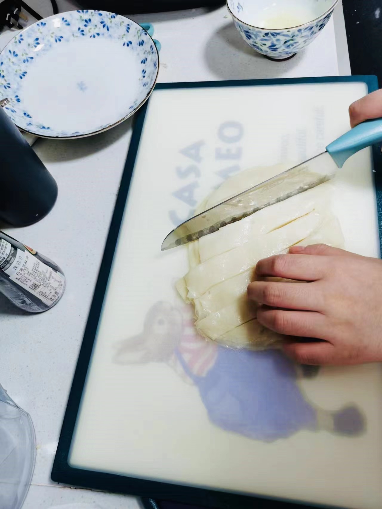 将金属盘放入凉水中降温,待不烫手之后,就可以取出一张完整的凉皮,之后将取出的凉皮切成长条装盘。