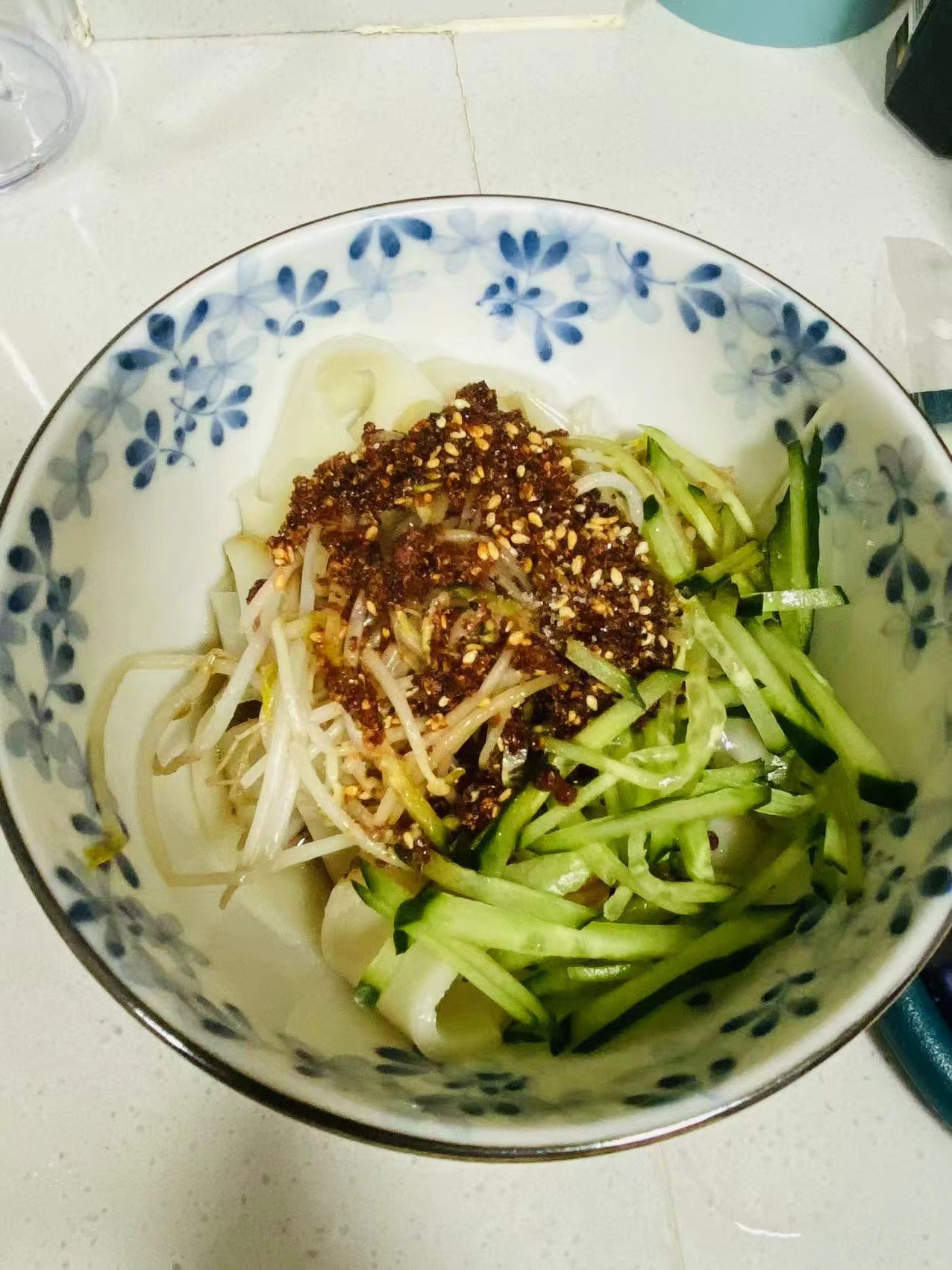 将蒜切成蒜末,加入清水做成蒜水,辣椒面泼热油,在碗中加入油泼辣子、蒜水、豆芽、黄瓜、醋、生抽、香油、盐,充分搅拌均匀后就可以上桌开吃了。