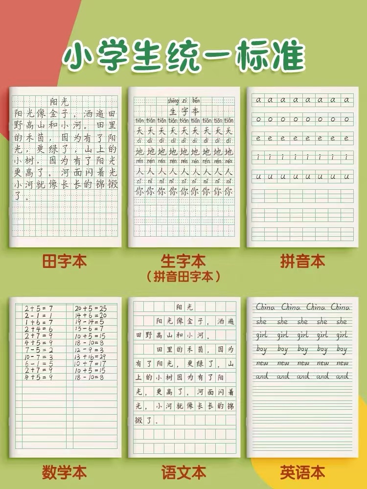 准备生字本、拼音本、算数本、田字本、单线双线本各2本备用即可,学校会发,或有特定要求,开学后按照老师要求购买。