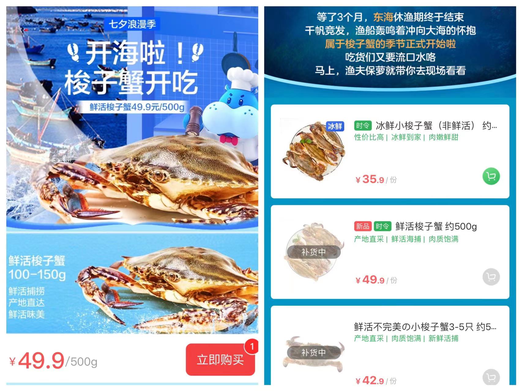 价格方面,叮咚买菜、盒马等平台的价格差别不大,刚刚上线的鲜活梭子蟹以3到5两的规格为主,每斤售价在50元左右,上市后很快就被抢购一空。