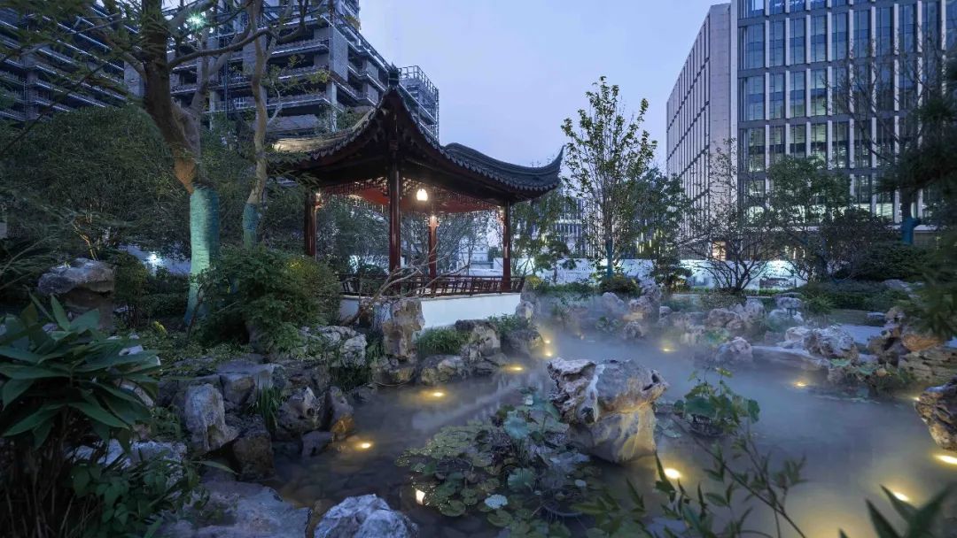 商船会馆花园以305年江南文化精髓为基调,通过历史的复原与重塑来展现诗意之境、园林之美。青墙黛瓦、亭台水榭、蜿蜒小径,使花园与会馆建筑风格和历史底蕴高度匹配、相辅相成。