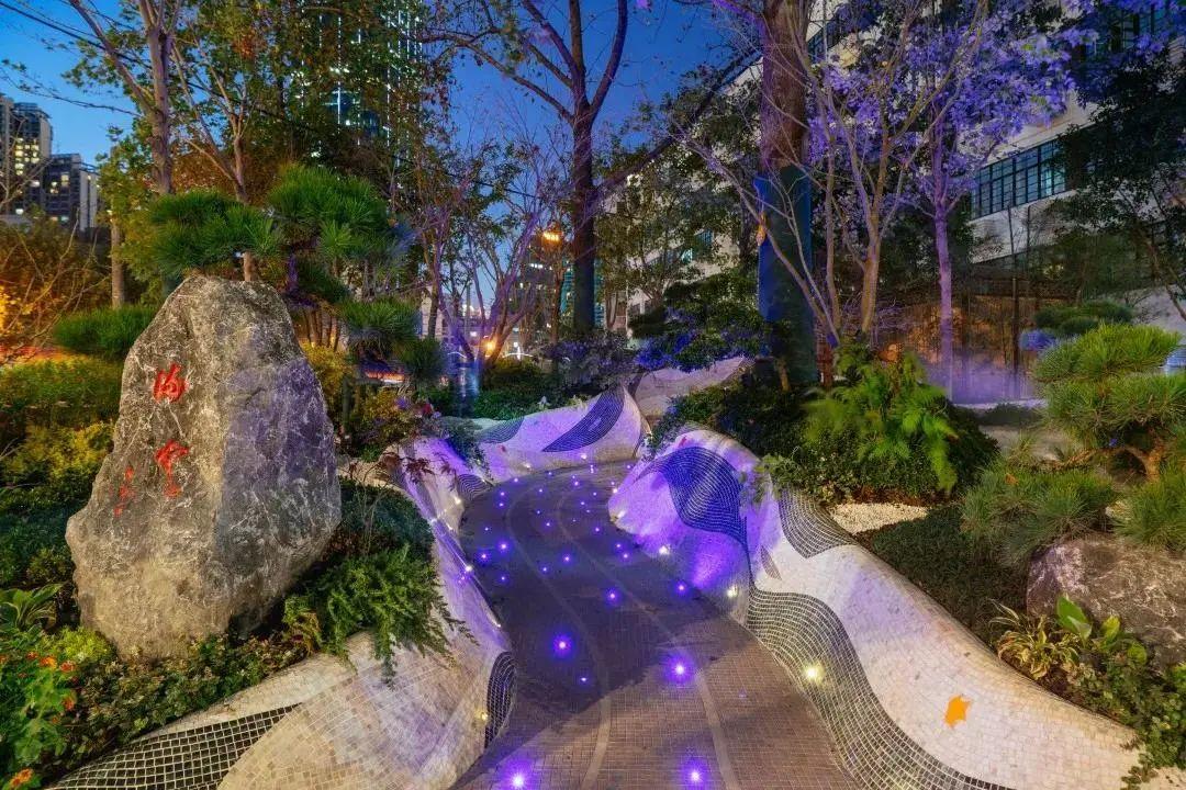 常熟花园设计风格延续了淮海大楼与瑞华公寓外立面的art deco风,园内布置了向阳花境、阴生花境和岛屿式花镜,夜晚彩灯亮起,夜游公园别有另一番风情。