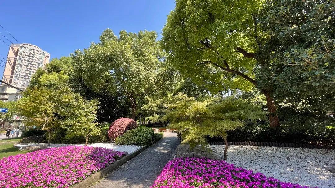 天钥桥路小游园以体育运动为主题,融入旱溪为景的花境,栽植了美国红枫、紫薇等新品种开花小乔木,是徐汇区新优品种展示的示范点,绿地内大树成荫,季相分明,微风拂过,树影婆娑。