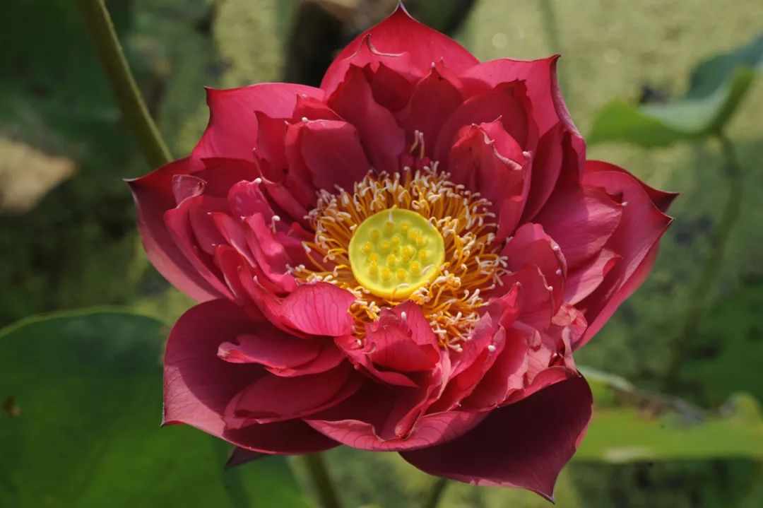 经典的大株型红莲,株型高大、花色艳丽,是大型红莲中花量较多的优良品种,单瓣型,花高于叶,也适合塘栽。