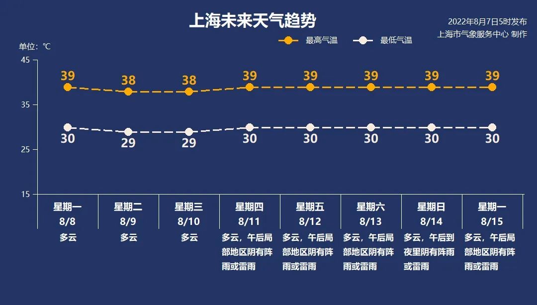 本周副热带高气压强势控场,高温持续发力,上海以晴或多云天气为主,午后可能来点雷阵雨降降温,效果有限,气温几乎走成平行线,最低29-30℃,最高38-39℃,极端最高气温可达39-40℃,注意防暑降温不松懈。
