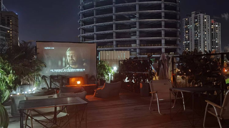不同店家对“放电影”的出发点不一样。“来这里的客人还是以拍照为主,电影都是随机播放的哦。”店里的工作人员小黄告诉笔者。笔者参与活动时,大荧幕正播放着电影《这个杀手不太冷》,而上层小露台则播放着《权力的游戏》相关的视频。除了露天的荧幕以外,帐篷里也都设有投影仪。笔者体验的这家店并不会提前公布电影排片,在整体氛围中,电影更像是一个场景设置,而不是精心设计的活动环节,成为人们消遣、聊天的背景音。受限于荧幕大小、场景设计和椅子摆放位置,并不是所有位置都能看到电影,电影对人们的吸引力打了折扣。