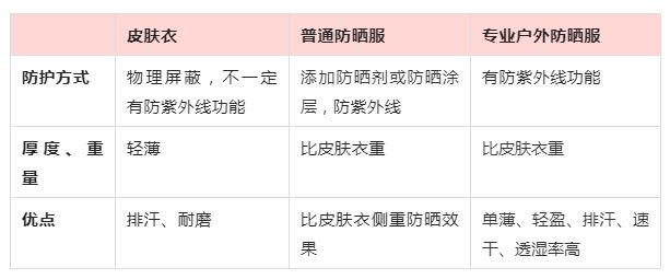 按照不同穿着场景、材质厚度等,不同防晒服各有以下优势: