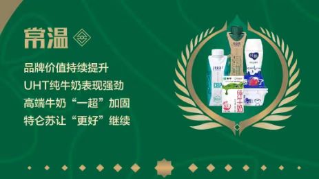 在常温产品方面,蒙牛UHT纯牛奶表现强劲,尤其是旗下单品特仑苏在产品销量、市场份额、品牌力方面都取得了优异的表现;纯甄通过主打“无负担,甄好喝”,实现了差异化突破;真果粒则以“茶香遇果粒,牛奶更美味”为卖点,实现了品牌价值持续提升。