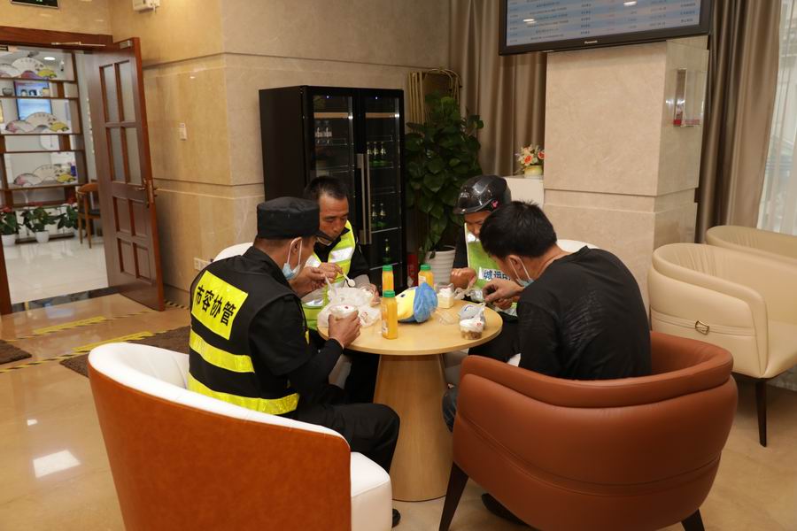 城市协管员在建行武康路支行劳动者港湾歇脚