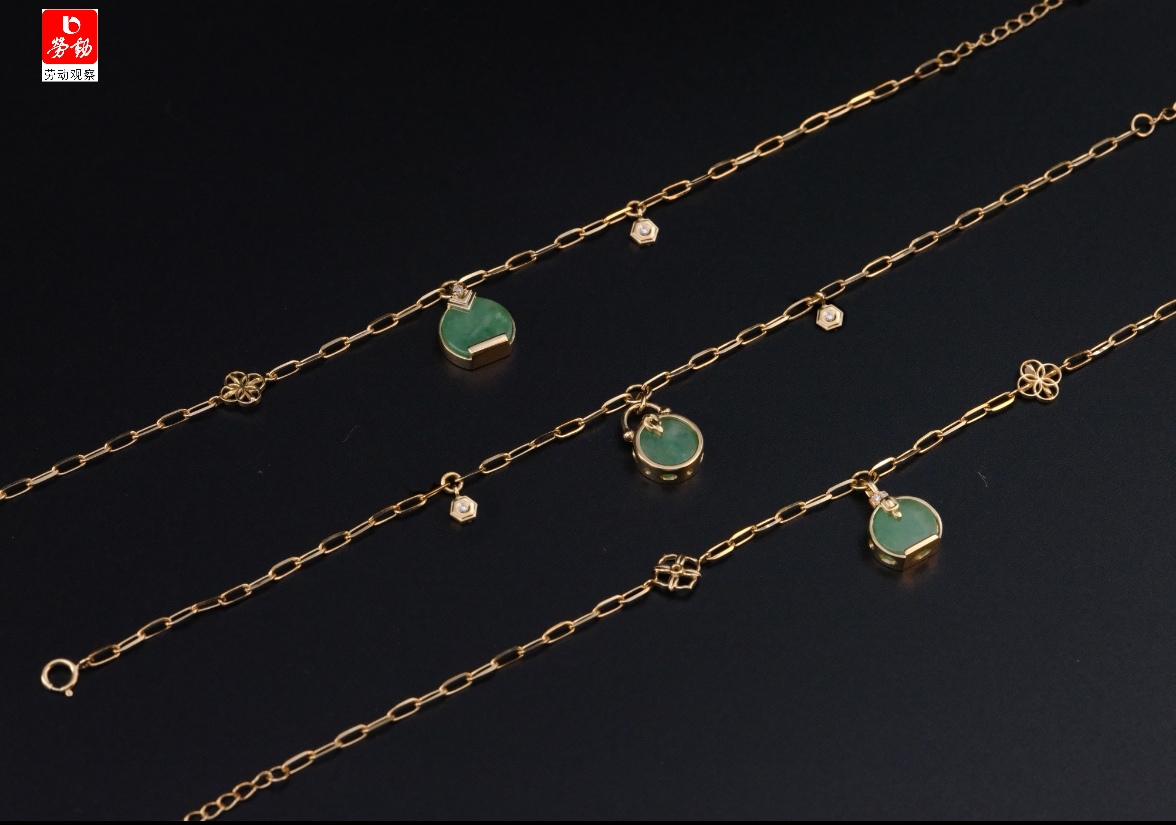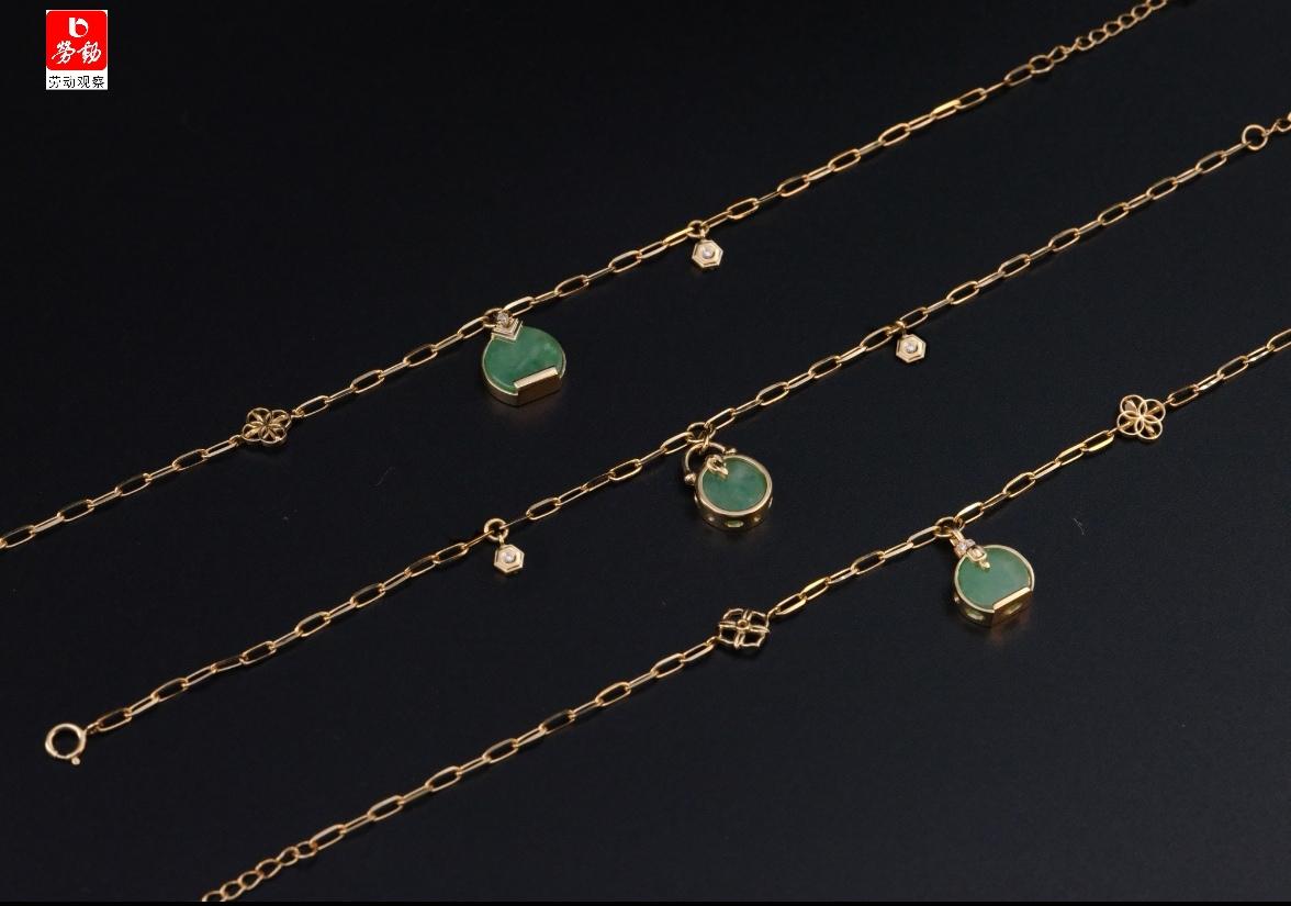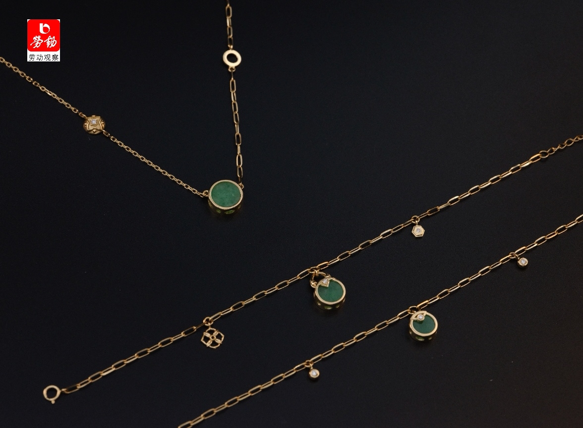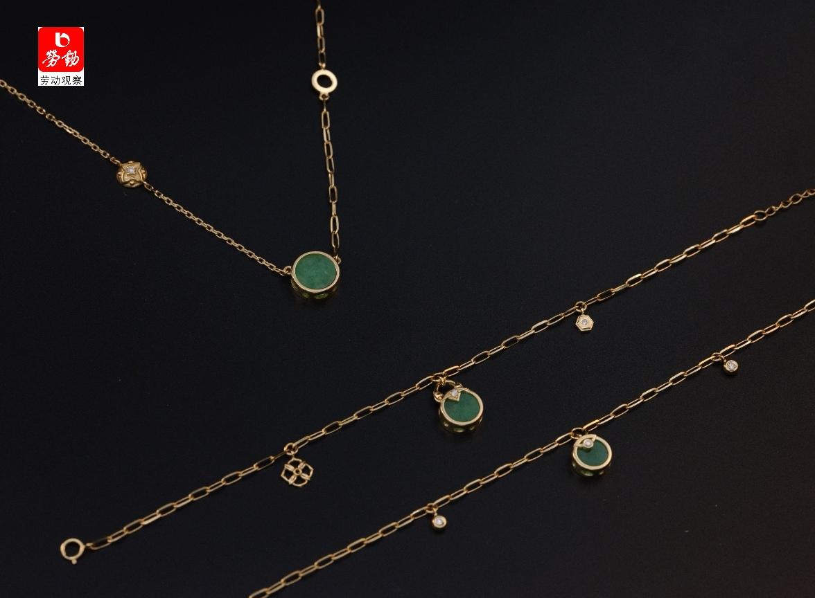 包罗万象系列以绿翡为主体,18K金和钻石为辅,纤细的链条上不对称地点缀着小颗钻石和K金花瓣,漂亮有型,轻奢灵动,简洁而不简单,非常好搭配,不管是日常佩戴还是出席重要场合都较合适,随意又知性。