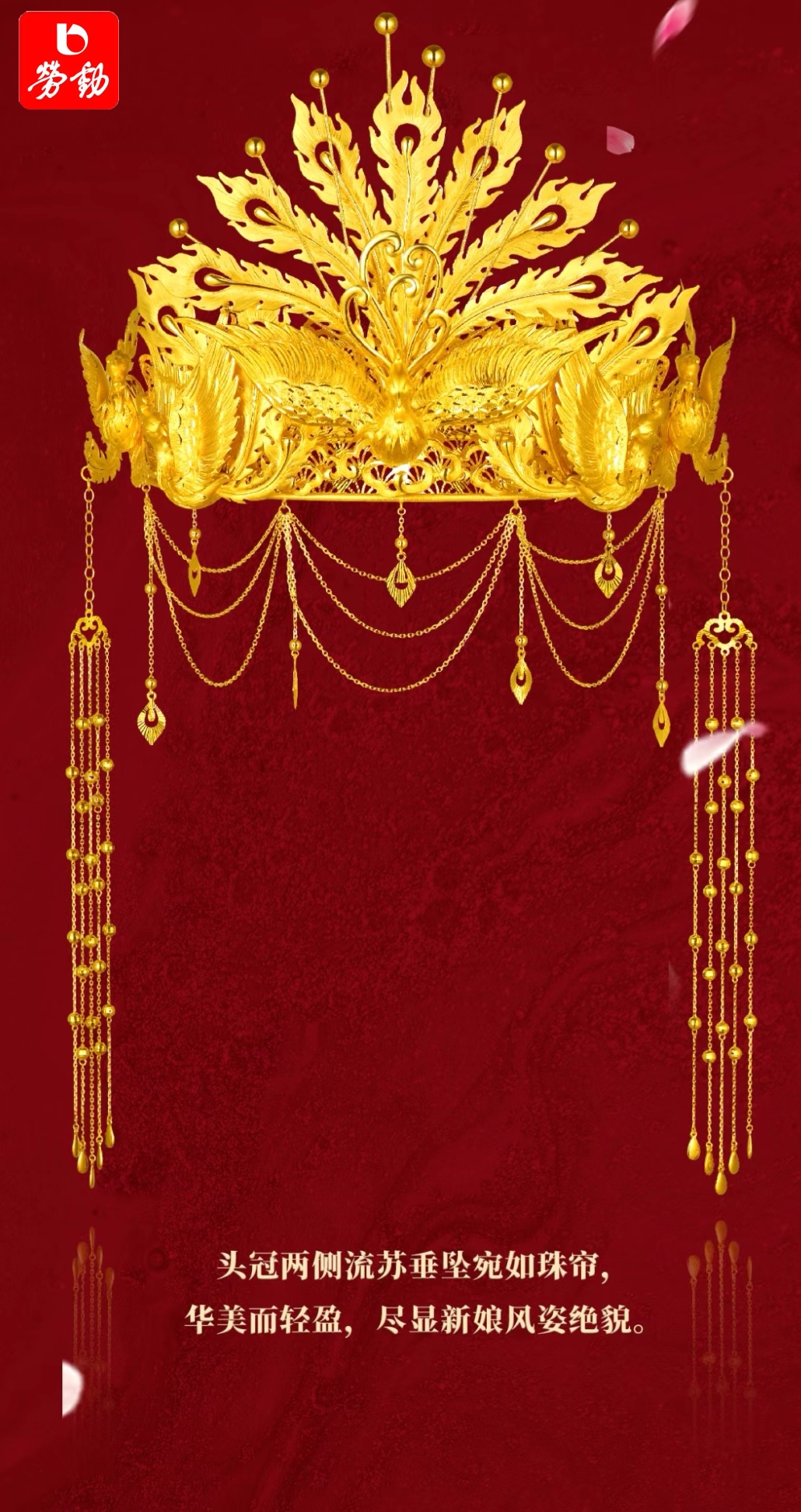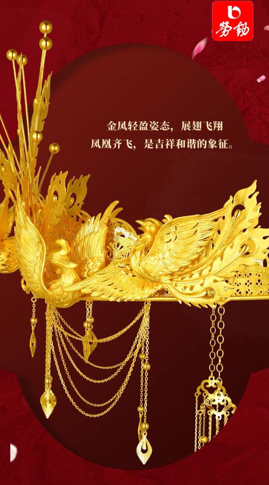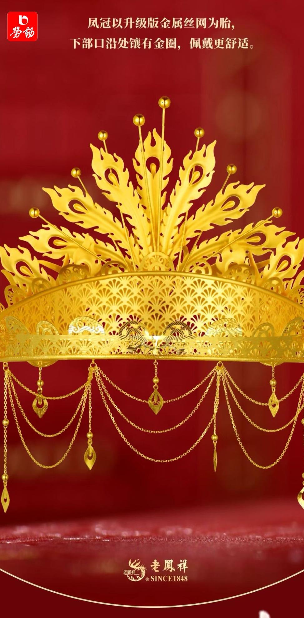 《凤舞九天》婚嫁系列,以凤凰为设计元素,定位中式高端婚礼金饰,是老凤祥品牌深耕中国传统文化的大制作。九天喻指天下,凤凰飞舞在天下之间,比喻凤凰(老凤祥)为全天下带来一派祥和盛世之气。采用古法制金工艺结合现代精工,科技研发创新,打造女性宫廷般尊贵的饰品。盛世有佳人,十里红妆,凤冠霞帔,一步一生花。
