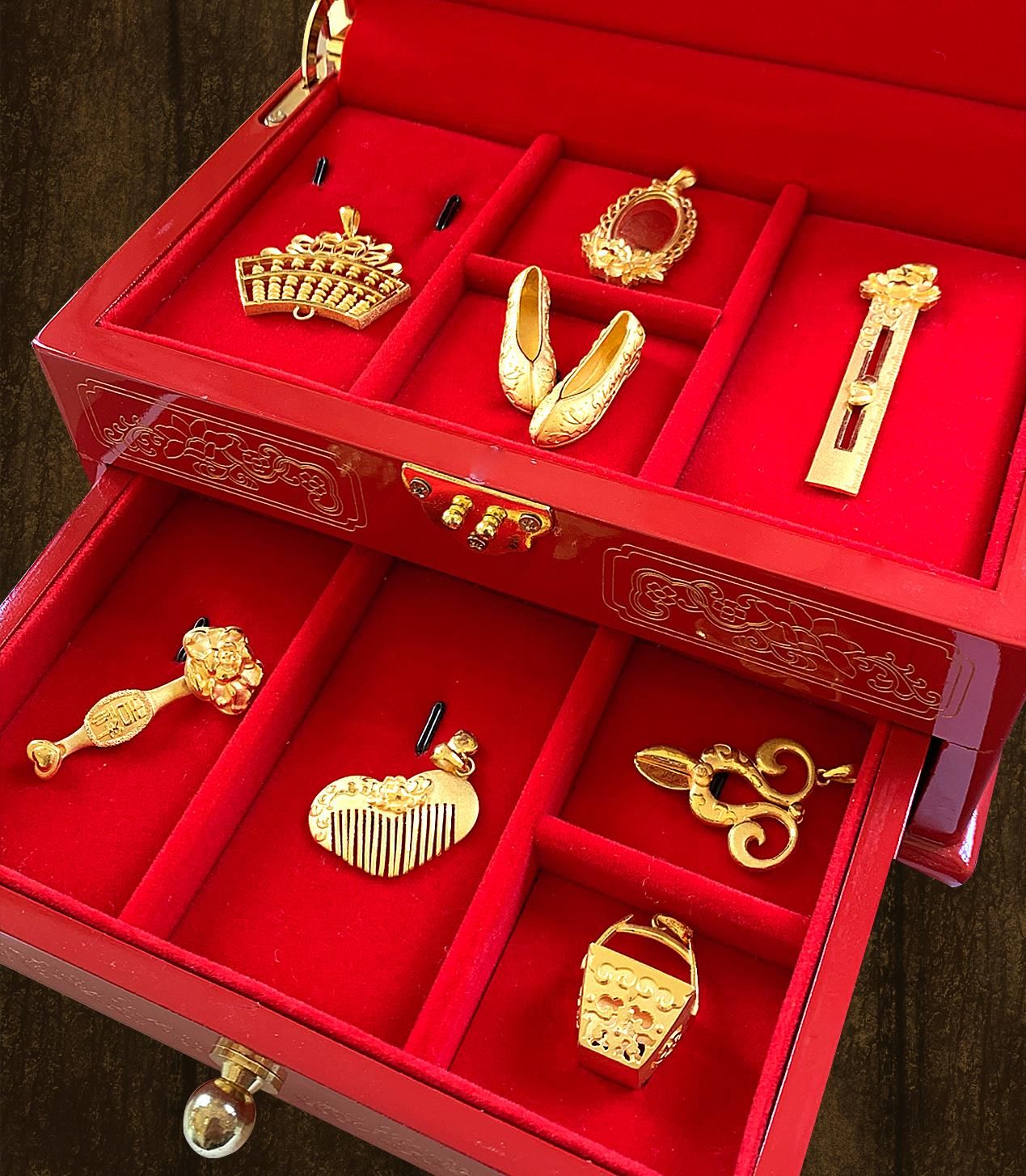 《黄金婚庆九宝》系列有:称、镜子、剪刀、算盘、绣花鞋及压钱箱等九种小配件,取 “天长地久”之意,造型雅致精美,可佩戴、摆设珍藏两用。整个系列不仅高雅、含蓄,同时也彰显了婚嫁首饰厚重的文化底蕴,很有收藏意义,摆在新房也特别讨喜。