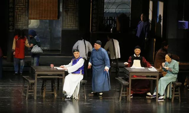 话剧《茶馆》剧照 从左至右依次为秦二爷、王利发、常四爷、松二爷
