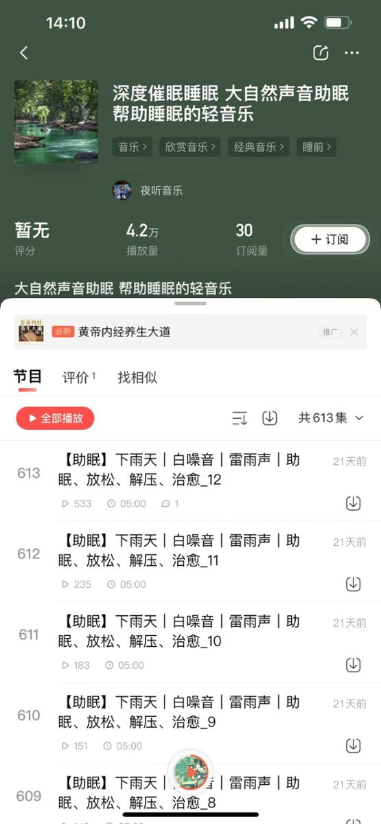 朱女士是一位职场妈妈,晚上一直睡不好,前不久喜马拉雅APP给她推送了一个“大自然声音助眠”的声音集,忍不住打开“流水声”这一集听了下,特别有身临其境的感觉,伴着水声、鸟叫声,森林里的雨滴滴答答落下来,非常有画面感,心一下子就静下来了,特别治愈。