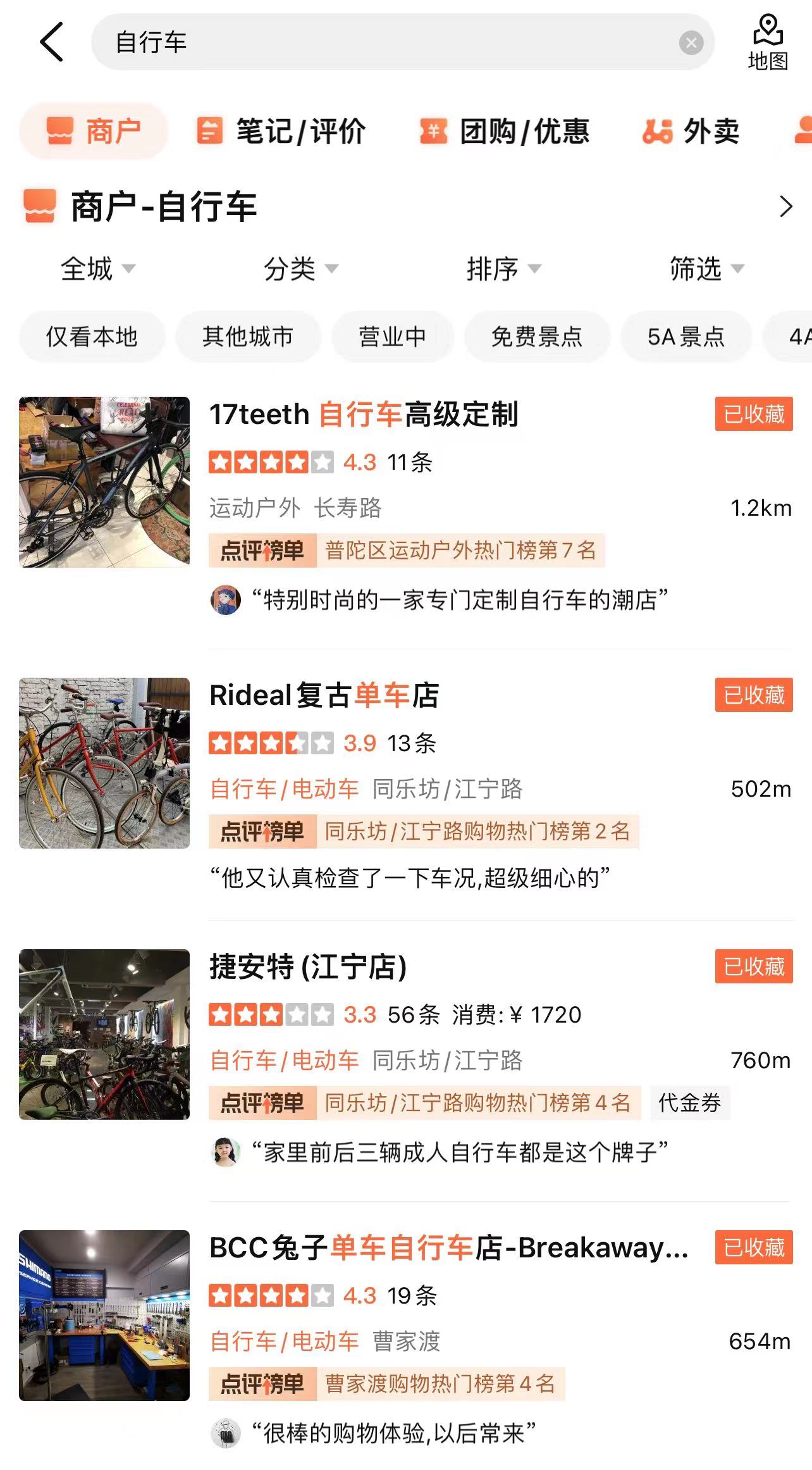 笔者在大众点评上搜索静安区范围内的自行车店,可以看到有热门品牌自行车、专业定制自行车、复古自行车等多家不同类型的车行。